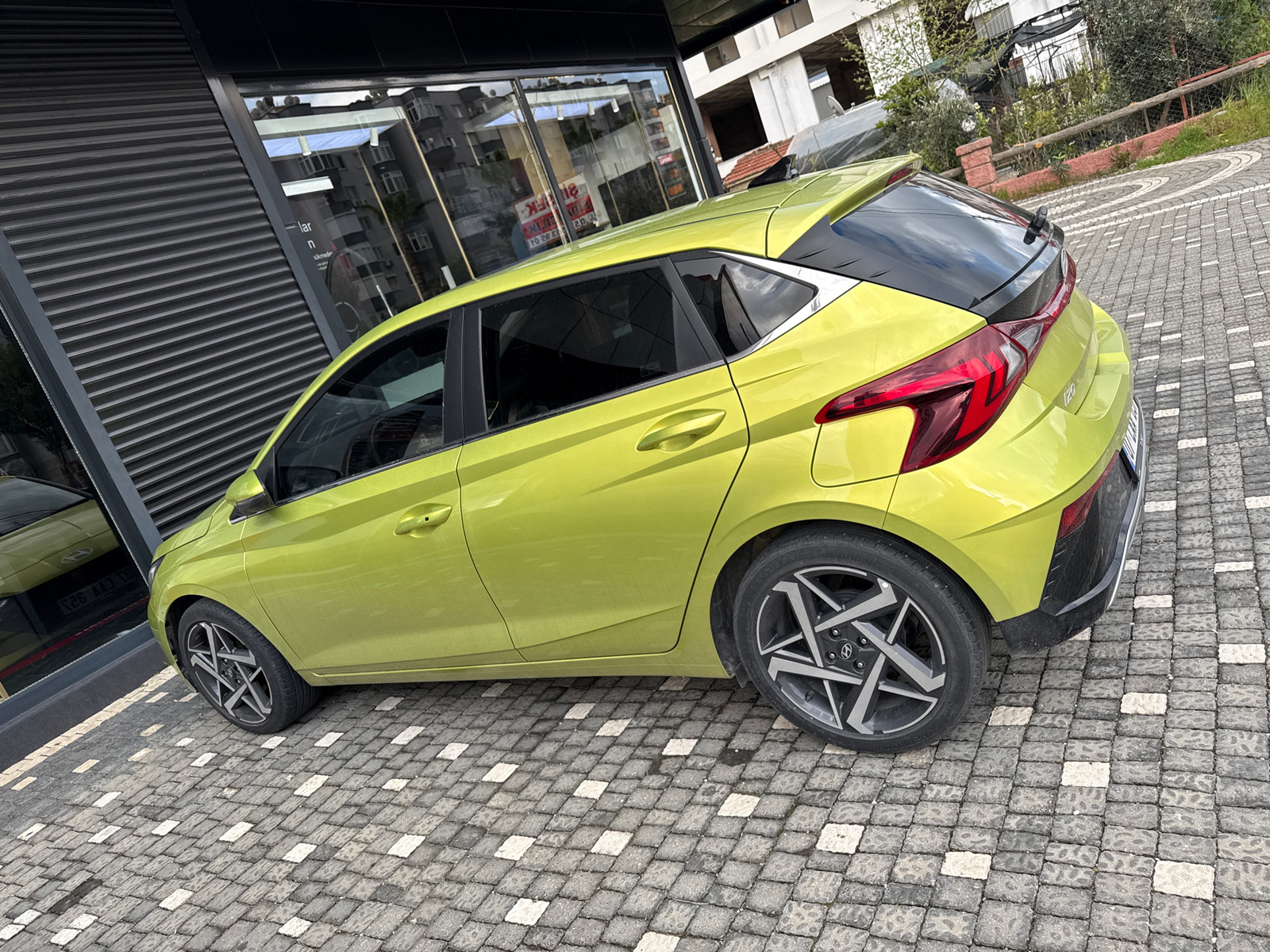 A yellow Hyundai i20 hatchback is parked on a gray and white cobblestone surface next to a building with a reflective glass front and a dark, horizontally-striped exterior. The car faces left and the…read more