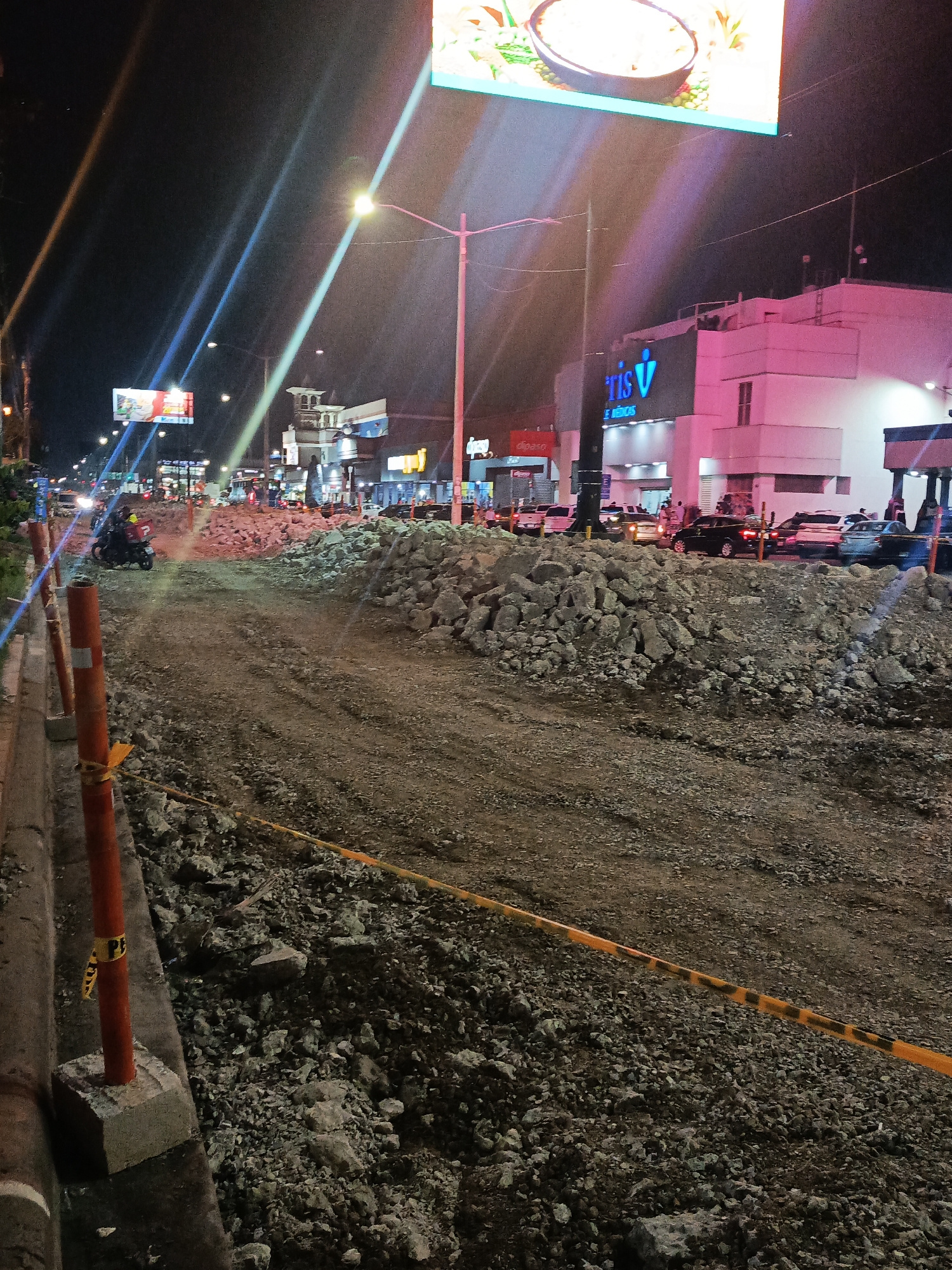 The image depicts a road construction site at night in Guayaquil, Ecuador. The road surface is torn up with piles of rubble and dirt, and safety cones and yellow tape mark the perimeter. A motorcycle…read more