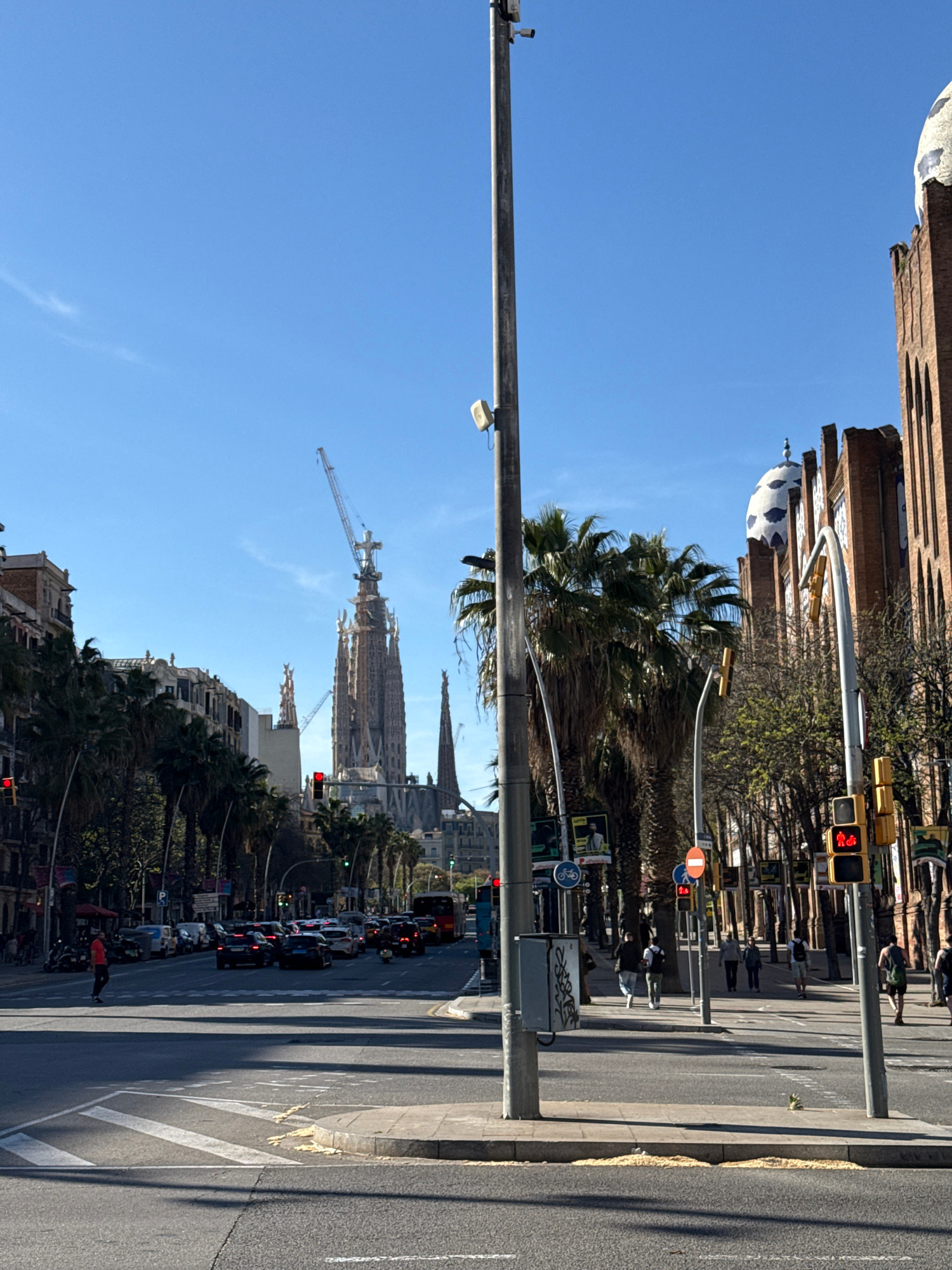 The image shows a street scene in Barcelona, Spain. Sagrada Familia is visible in the distance, partly obscured by palm trees. A crane is positioned near the basilica. The street has pedestrian crossiβ¦read more