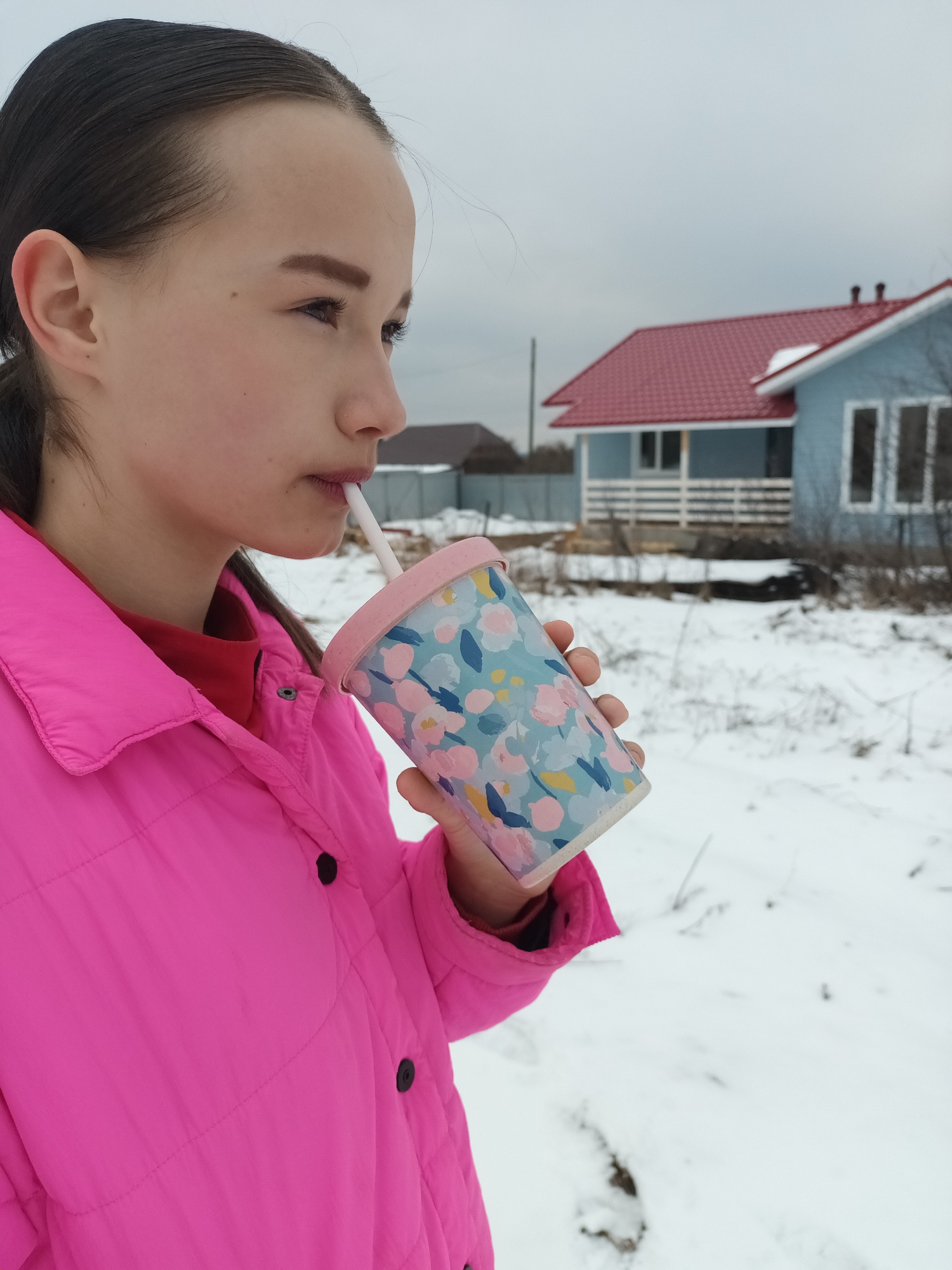 A young person drinks from a straw in Ольховка, Russia, on a snowy day. They wear a bright pink puffy jacket. The cup they are drinking from is pastel colors. A house with a red roof is in the backgro…read more