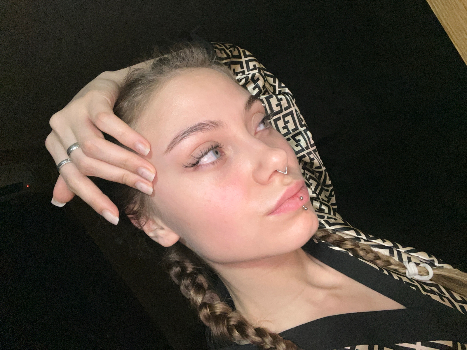 A young woman is depicted in a medium shot, facing upwards and slightly to the right. She has light skin, blue eyes, and blonde hair styled in braids. Her left hand is positioned near her temple, with…read more