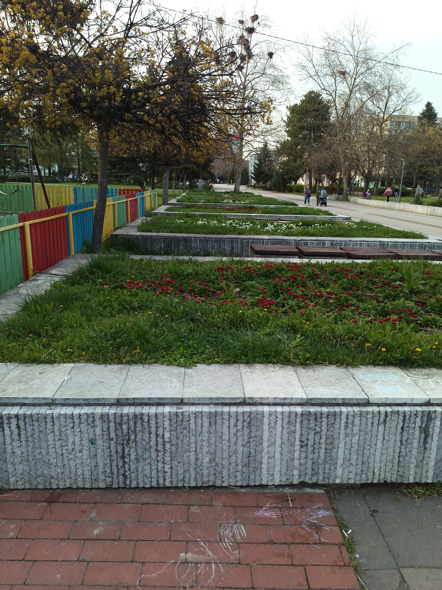 The image depicts a street scene in Targovishte, Bulgaria, featuring a series of elevated flower beds along a pedestrian walkway. The flower beds are constructed with a gray, textured concrete base an…read more