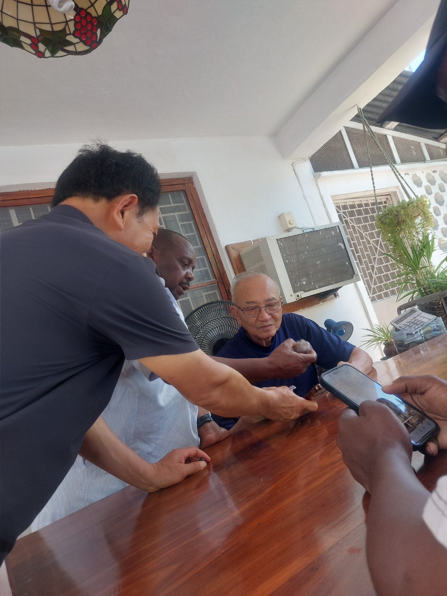 An indoor scene in Dar es-Salaam, Tanzania, captures a gathering of several men around a polished wooden table. The primary focus is an older, light-skinned man with glasses, wearing a blue shirt, sea…read more