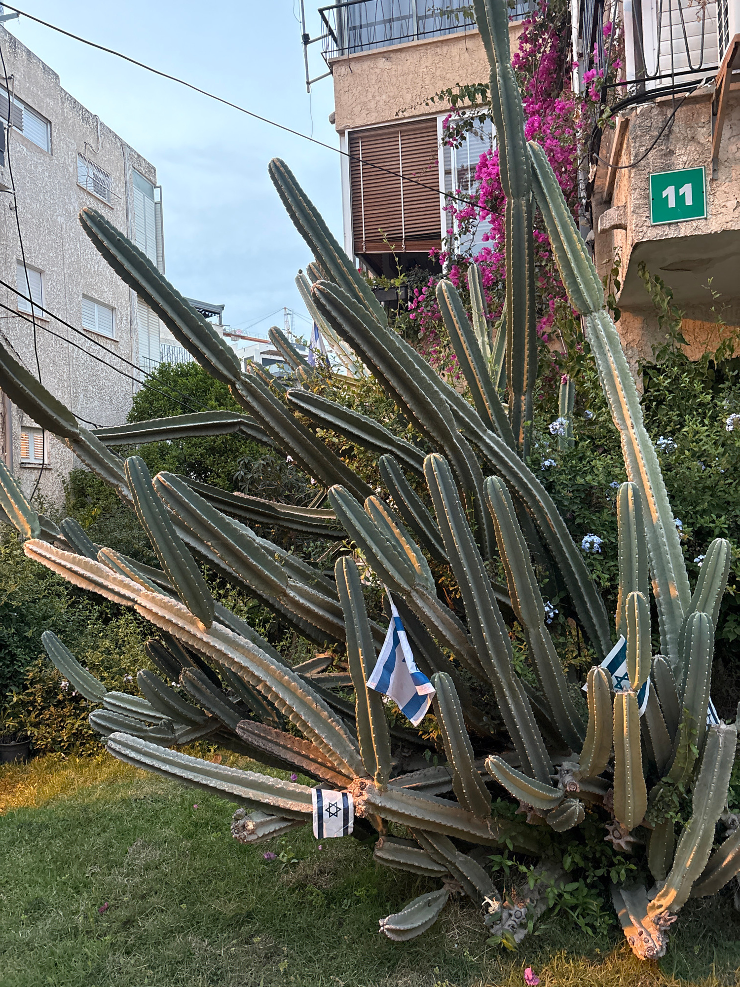 A large, upright cactus plant dominates the foreground, adorned with several small Israeli flags. The cactus is surrounded by green foliage. Behind the cactus, a building with pink bougainvillea casca…read more