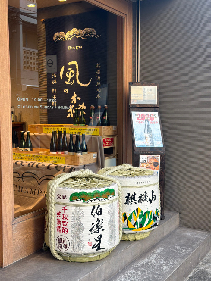 The image shows a storefront selling sake. A black banner with gold Japanese script indicates the store's origin since 1719 and the opening hours, 10:00-19:00, closed on Sundays and holidays. Two sake…read more