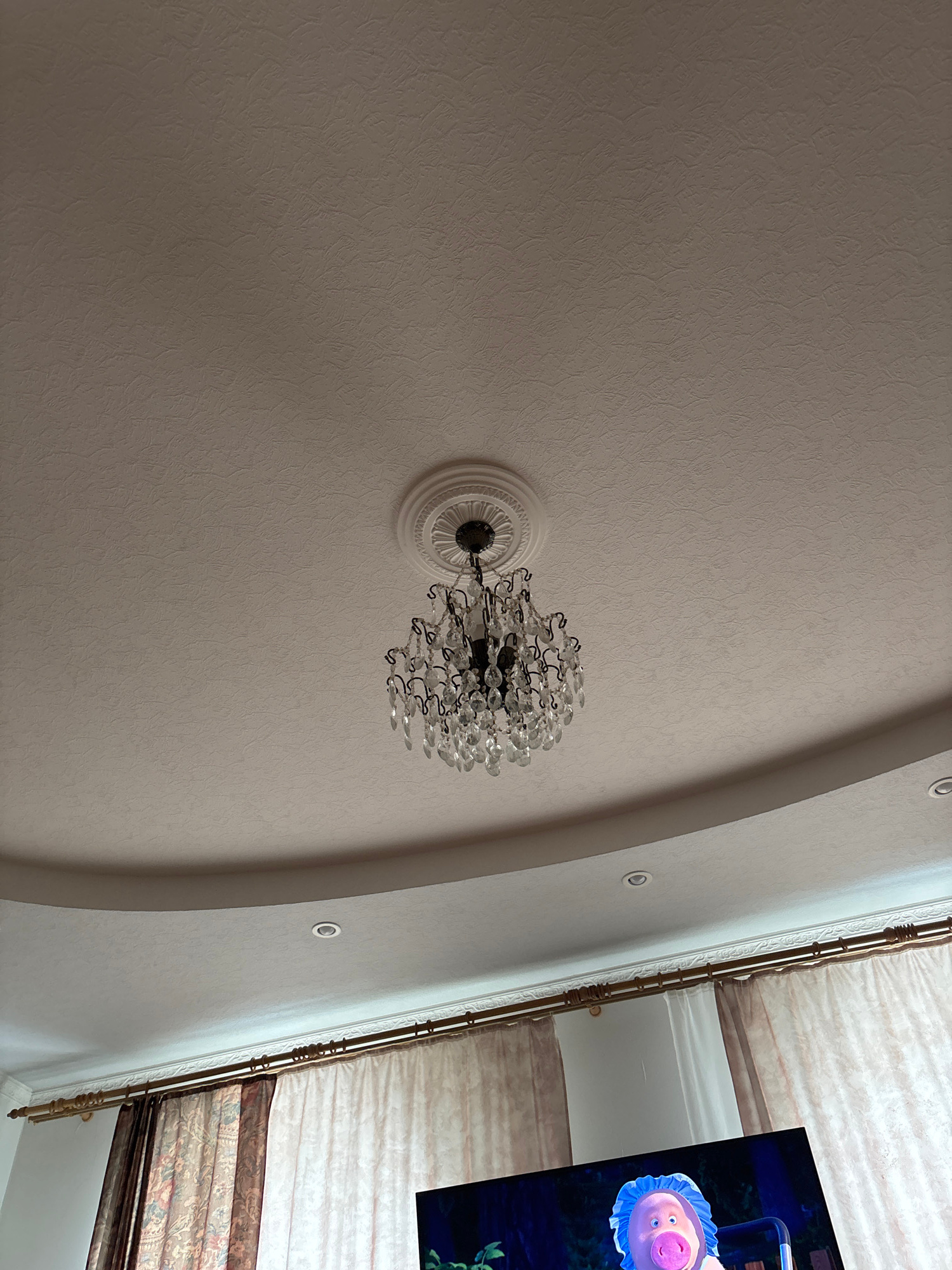 The image shows a view looking up at a ceiling with a decorative chandelier in a room. The ceiling is textured, with a slightly off-white color. The chandelier is ornate, featuring a circular base wit…read more