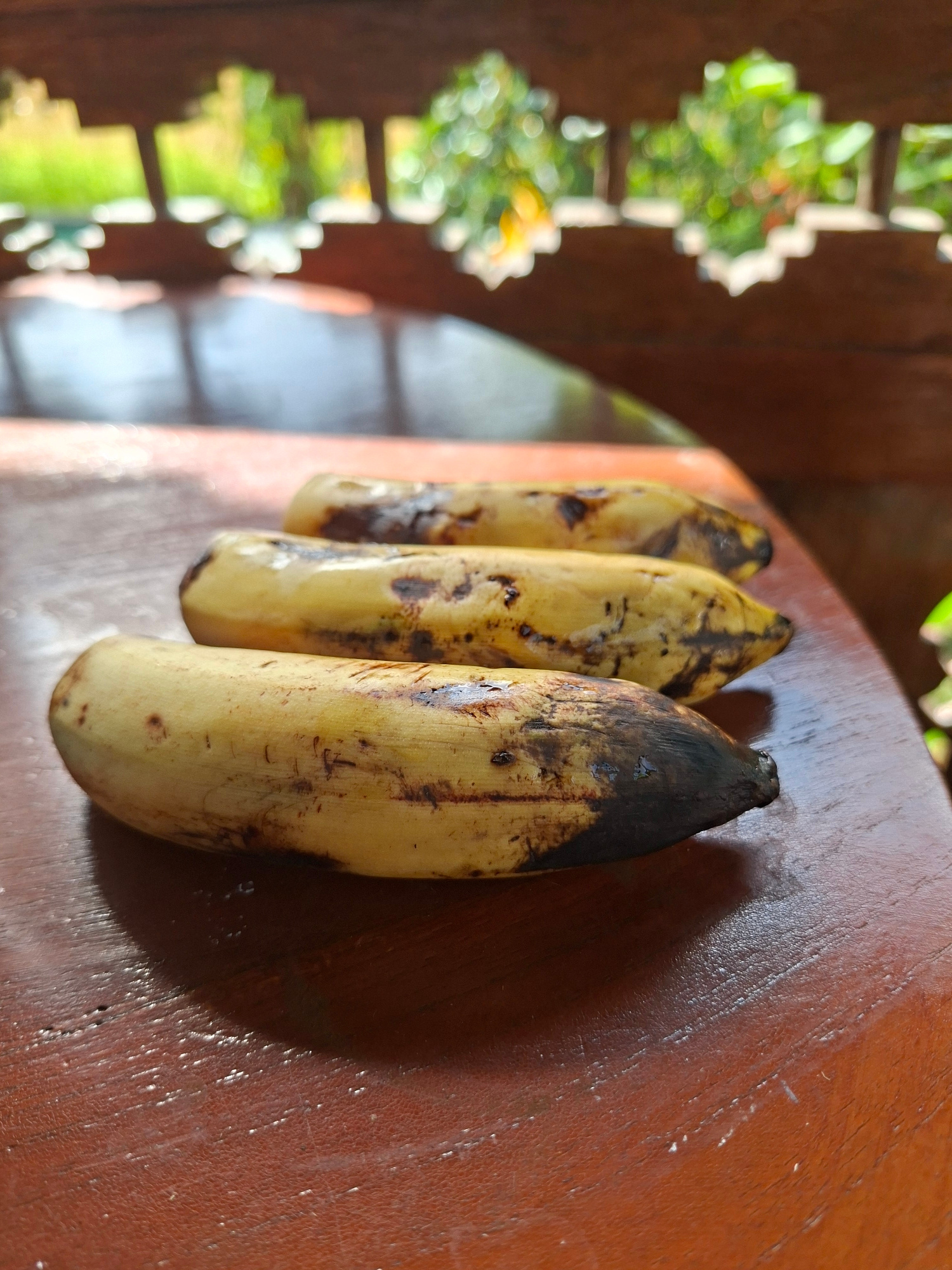 The image shows three overripe bananas lying on a glossy, reddish-brown surface, likely a wooden table or counter. The bananas are yellow with brown spots, and the top of the banana closest to the vie…read more