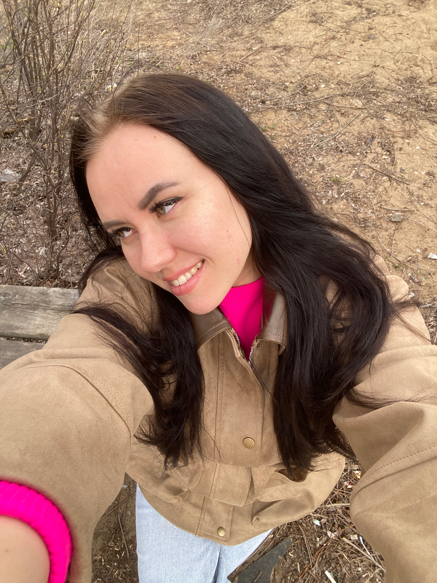A selfie photograph taken outdoors, possibly in or near Chaikovsky, Russia, shows a young woman with dark hair and fair skin. She is wearing a bright pink top under a light brown jacket. The backgroun…read more