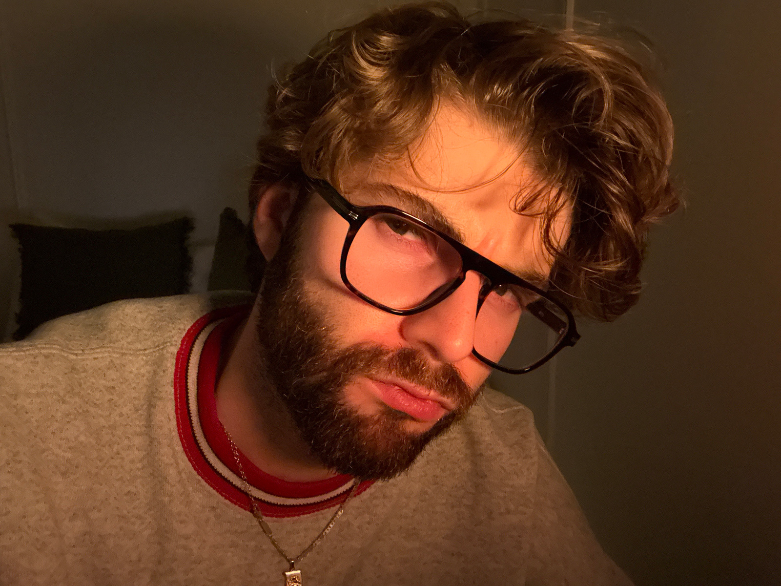 A close-up, inverted portrait of a Caucasian male with fair skin, brown wavy hair, a brown beard, and eyeglasses. The man is wearing a light gray sweatshirt with a red and white striped collar and a s…read more