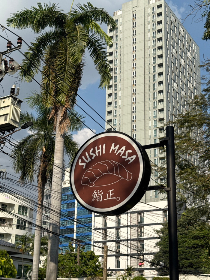 The image depicts an urban street scene in Bangkok, Thailand, centered on a circular brown business sign. The sign, edged in white, displays "SUSHI MASA" in white capital letters curved at the top, a…read more