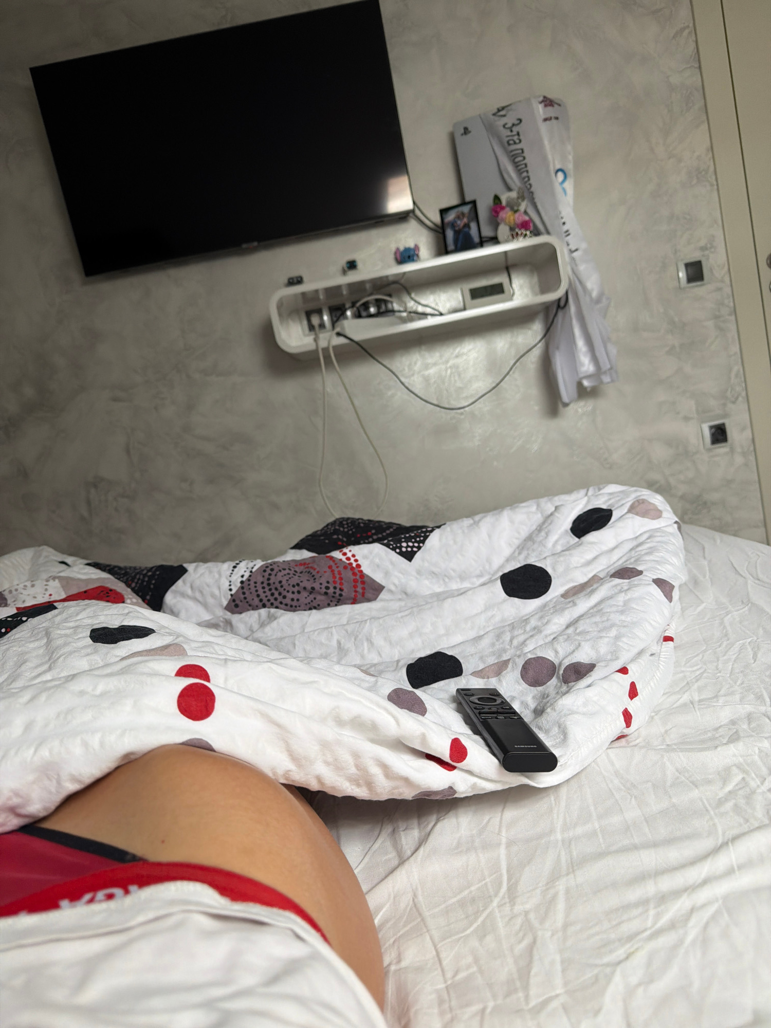 The image shows a view from above onto a bed with white sheets and a patterned duvet, likely in a residential interior. A dark Samsung remote control rests on the duvet. Partial view of a person's leg…read more