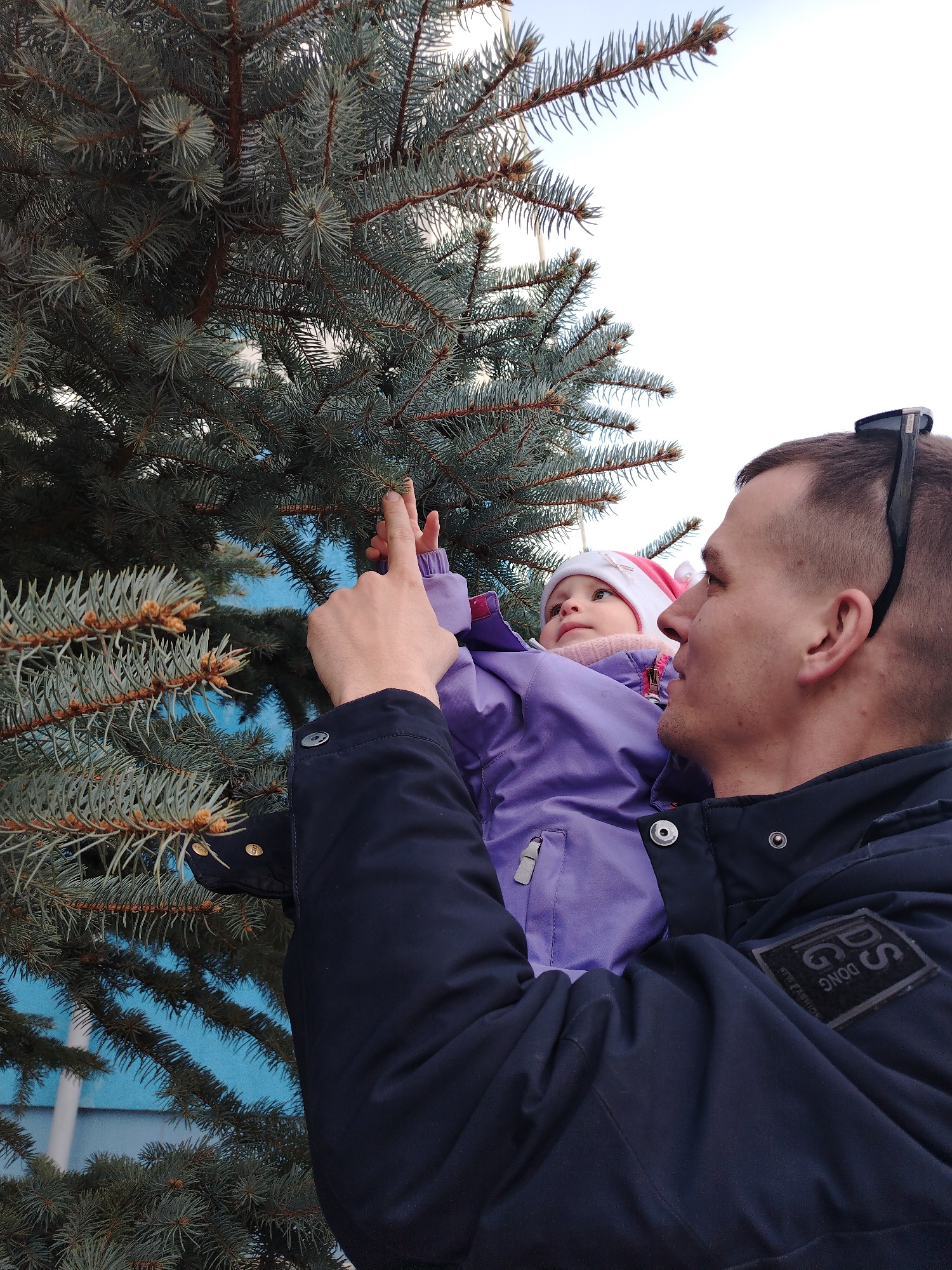A medium shot captures a man holding a baby next to a large evergreen tree. The man, positioned on the right side of the frame, is Caucasian with short hair and is wearing a dark blue jacket with a pa…read more