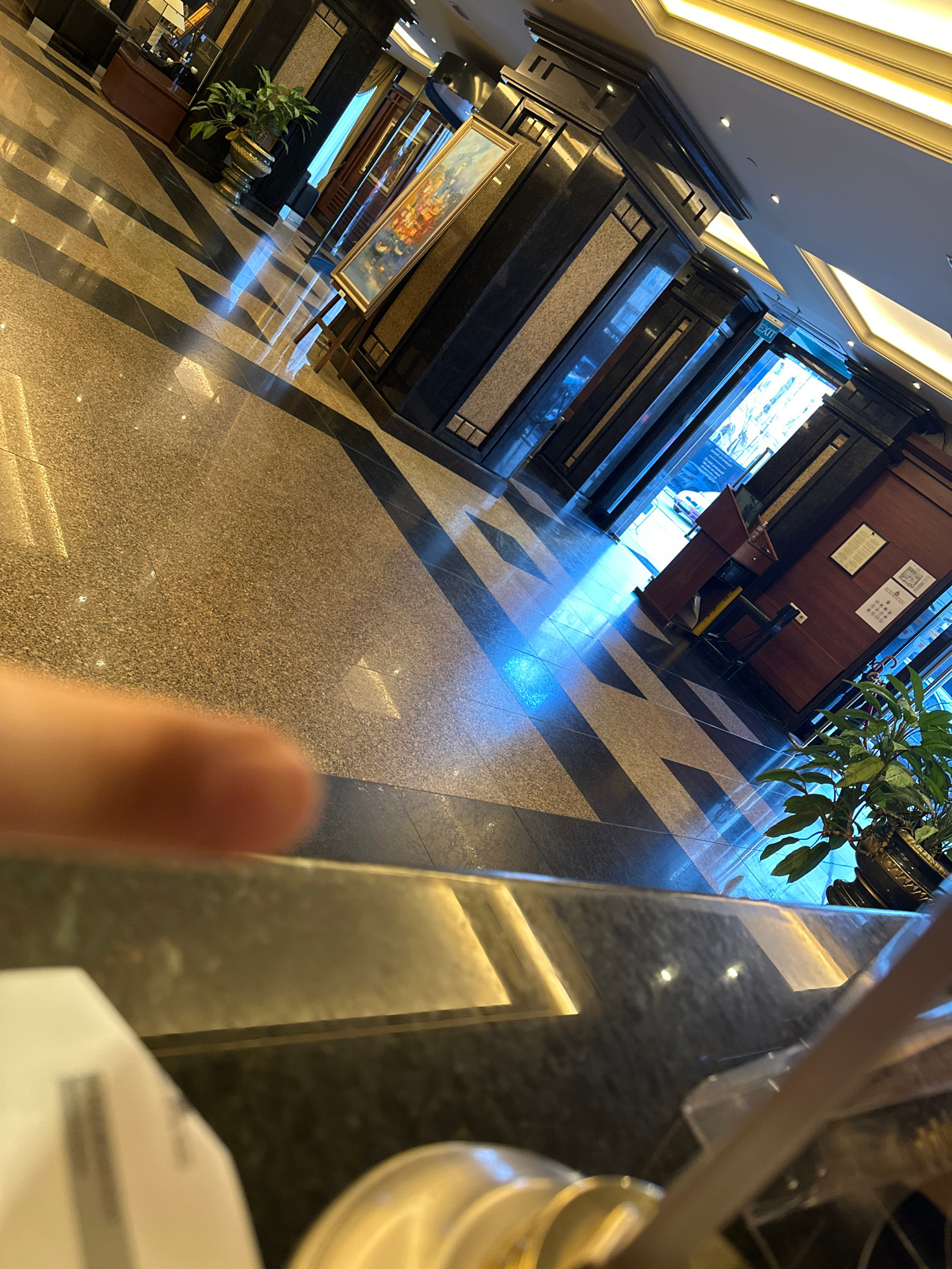 The image captures an indoor view of what appears to be a hotel lobby. The foreground is dominated by a blurred human finger. The lobby features a reception desk with a plant on top, elevators, marbleβ¦read more