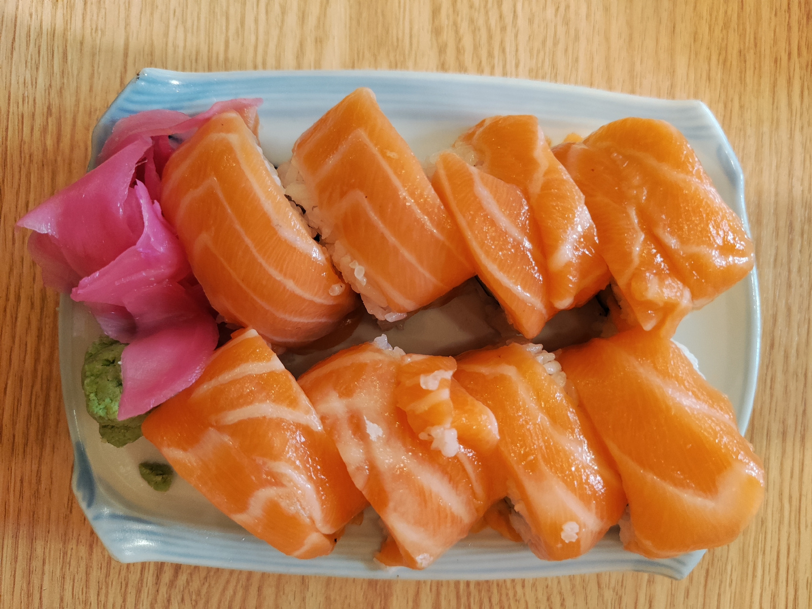 A top-down shot of a rectangular, light-blue plate on a wooden surface. The plate contains ten pieces of salmon sushi, arranged in two rows of five. Pickled ginger (pink in color) and a small amount o…read more