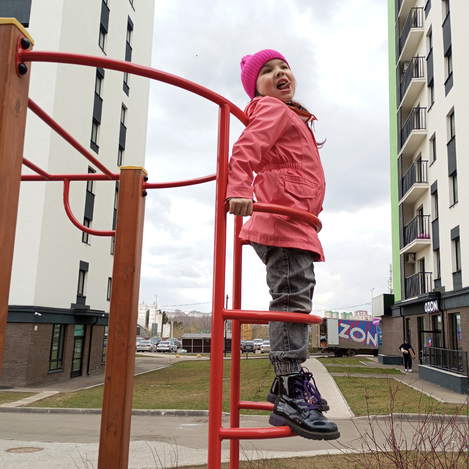 In Pervomaysky, Russia, a young girl with brown hair wearing a pink beanie, a pink jacket, gray pants, and black boots stands on a red playground structure. She has her tongue out and is looking upwar…read more