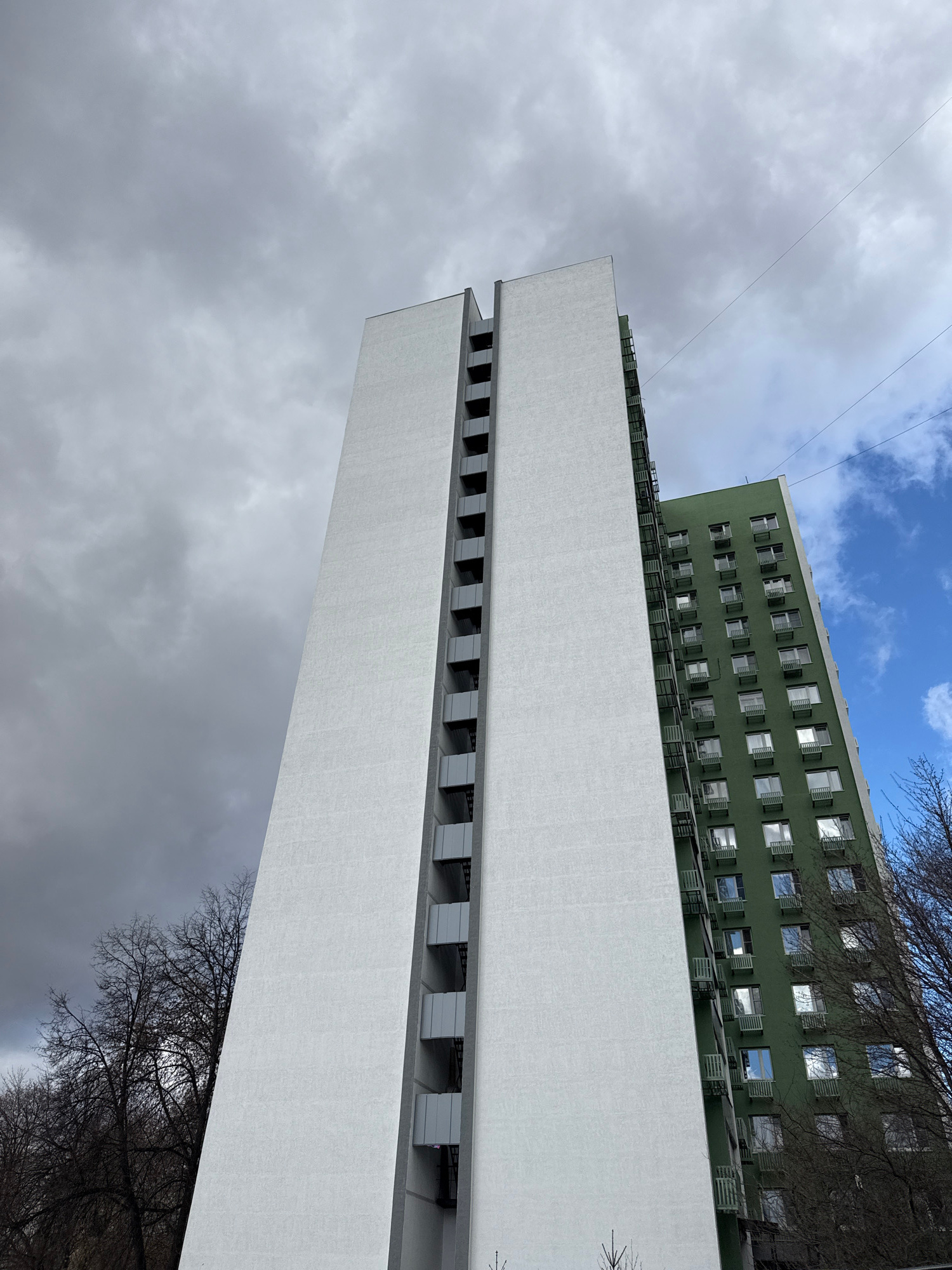 The image depicts the "Izvestia" printing house building, a constructivist architectural landmark located in Moscow, Russia. The view is a low-angle shot, emphasizing the building's height and geometr…read more
