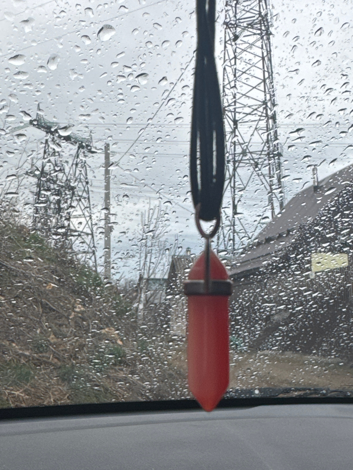 The image, taken through a rain-covered window, shows a red, torpedo-shaped object dangling from a black cord. Outside the window, the scene includes high-voltage power lines and a partially visible l…read more