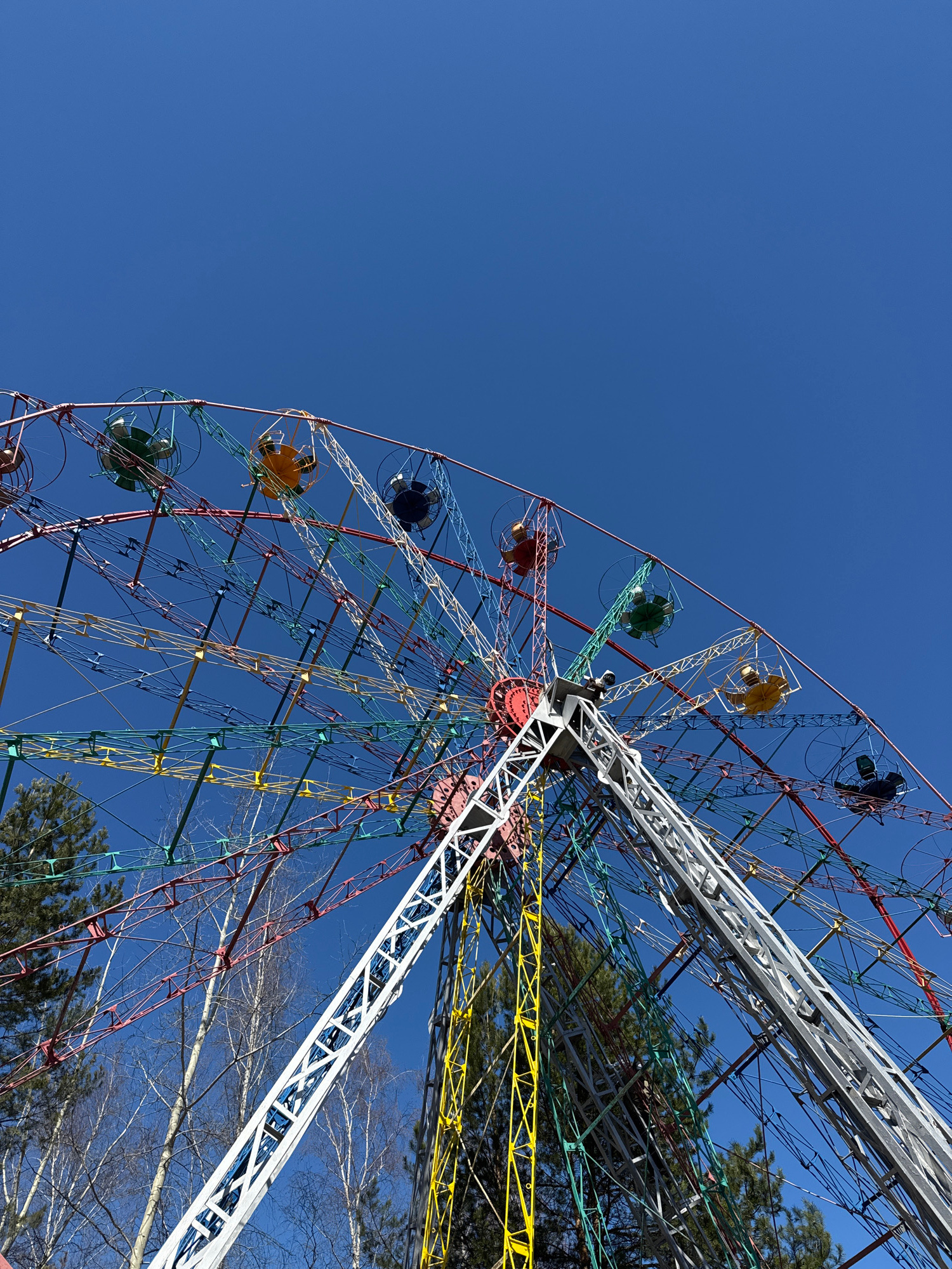 The image depicts a low-angle view of a Ferris wheel in Chaikovsky, Russia. The sky is a clear, vibrant blue. The Ferris wheel's structure is made of multi-colored metal beams, with passenger cabins i…read more