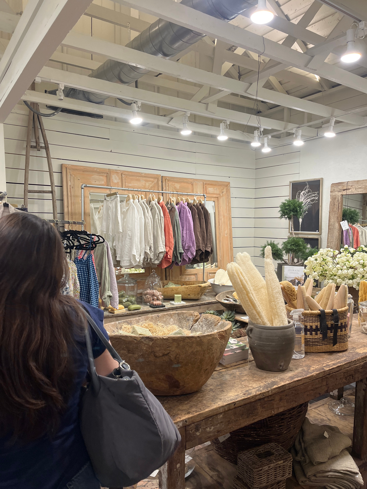 The image captures the interior of a retail store, likely a boutique, in Fredericksburg, Virginia, USA. Overhead, a white painted open ceiling structure with lights is visible. A rack of clothing hang…read more