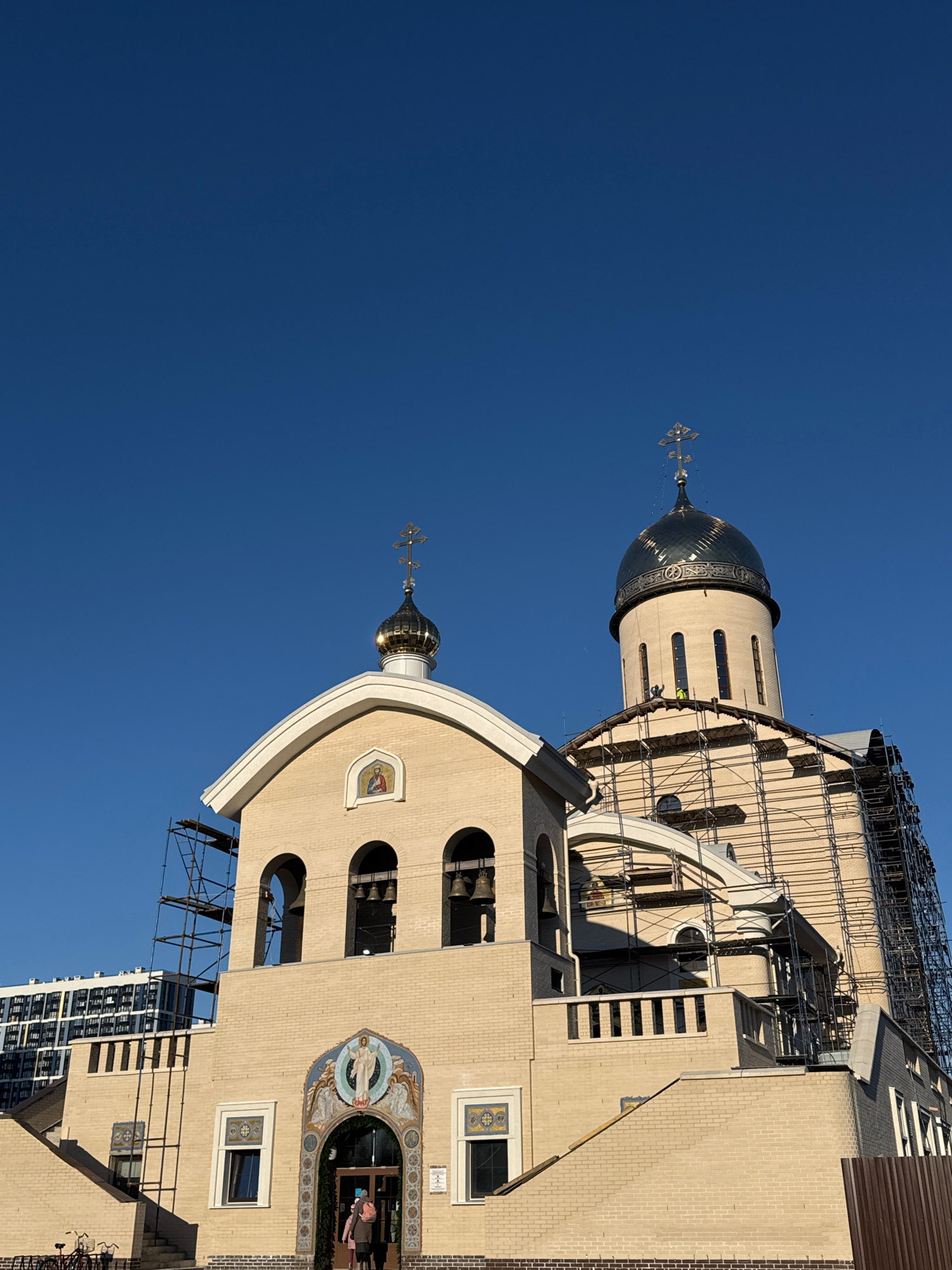 The image shows the facade of a religious building, possibly an Eastern Orthodox church, against a clear blue sky. The building has two prominent domes topped with crosses, one with a silver-toned fin…read more