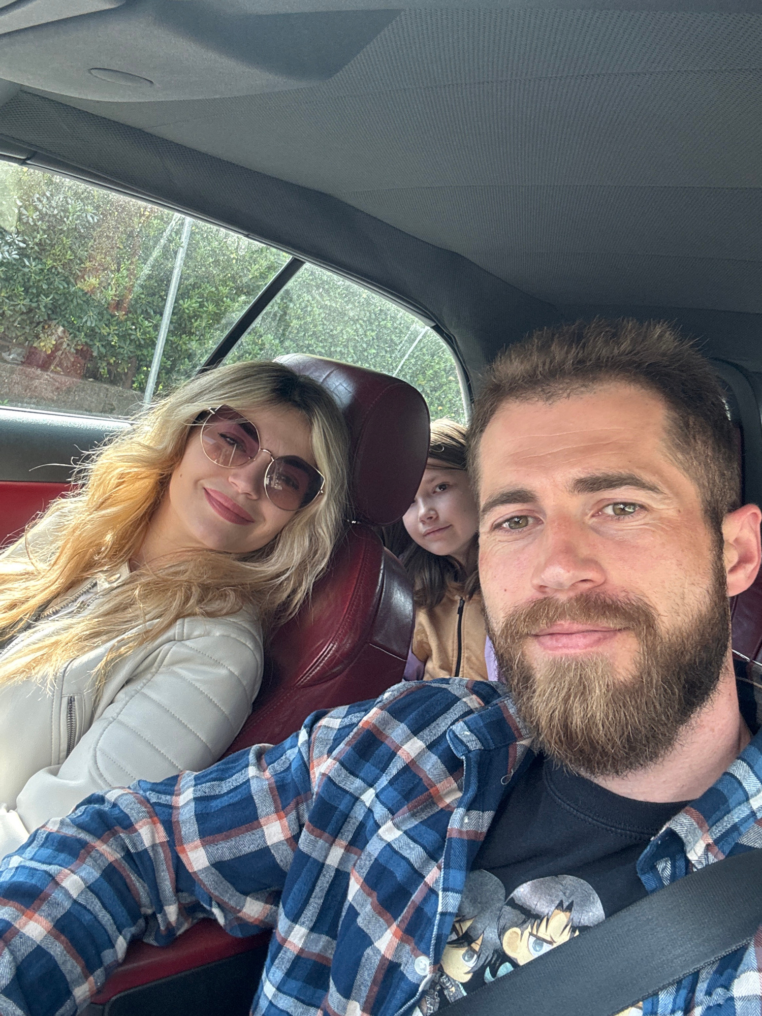 The image is an interior shot of a vehicle, likely a car, with three individuals visible. A man with a beard and wearing a blue plaid shirt over a black t-shirt is positioned closest to the camera. Be…read more