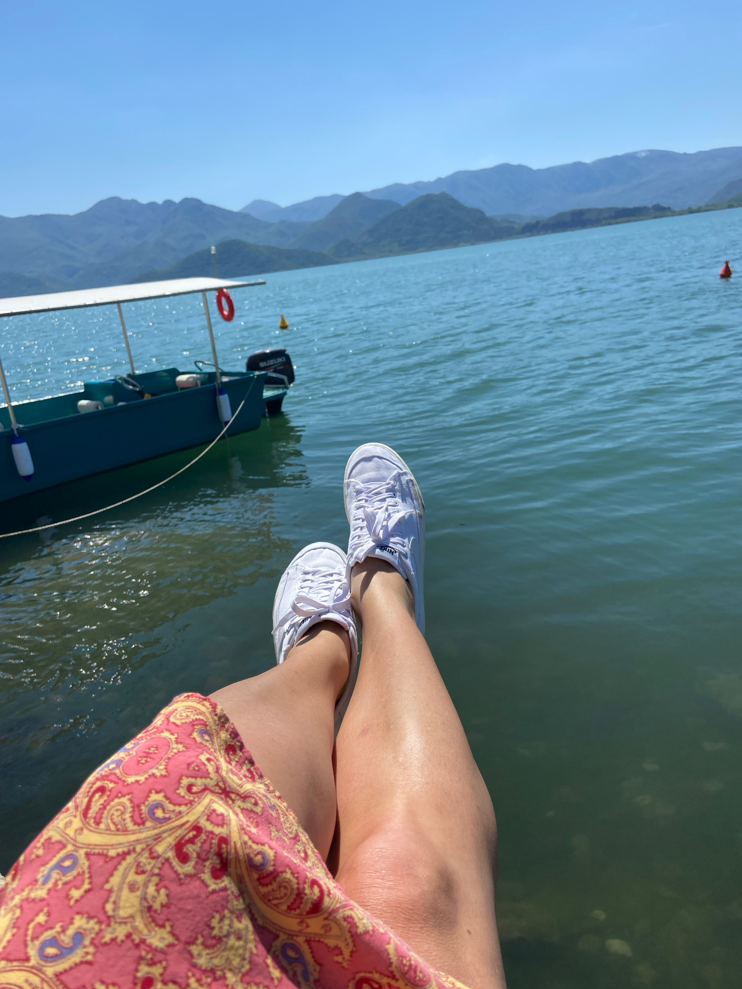 A person's legs, clad in white sneakers and a patterned pink and yellow dress, are positioned over the edge of what appears to be a small boat or dock on a body of water. The water is light green with…read more