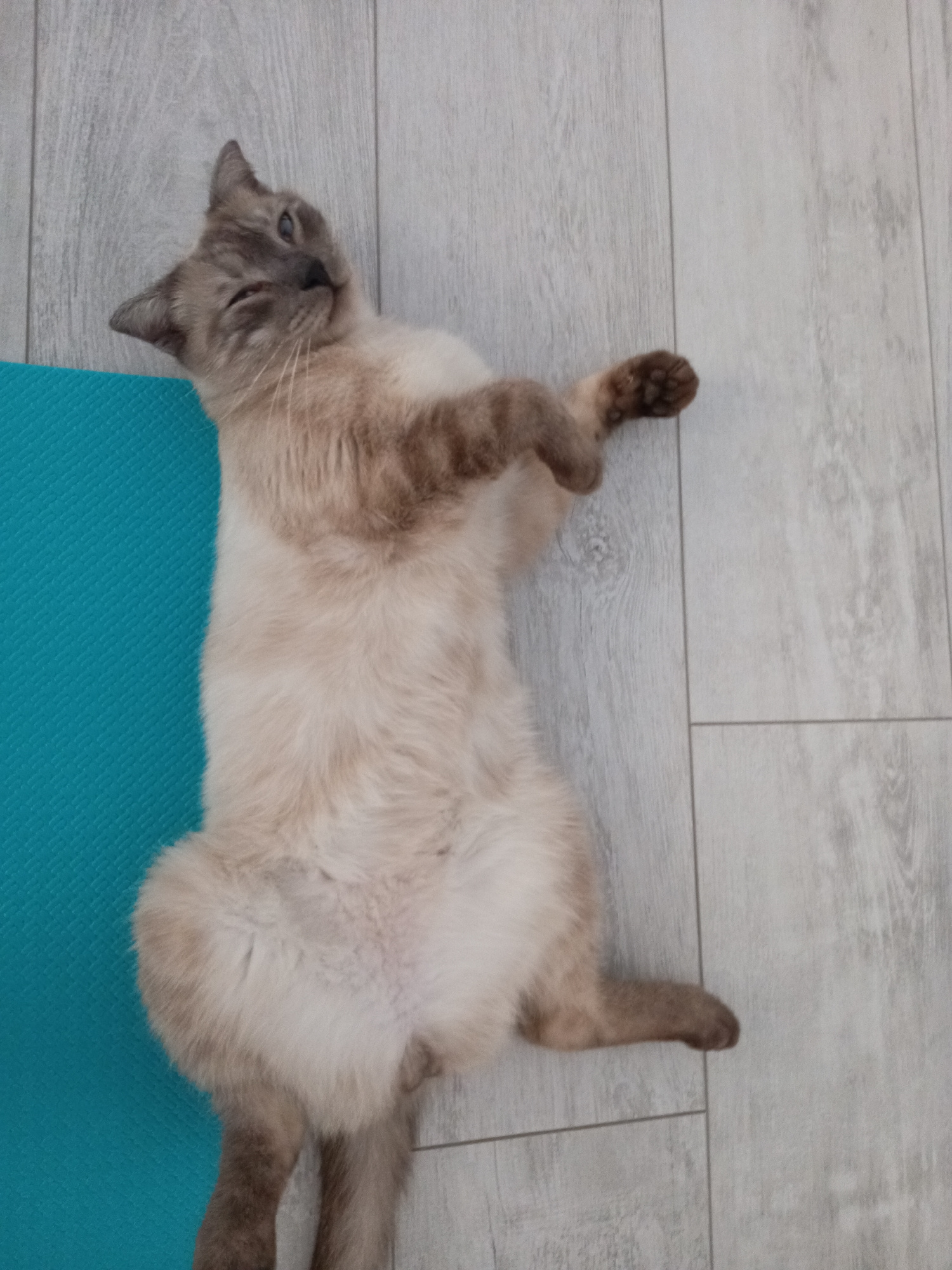 A light-colored cat is depicted lying on its back, stretching out across a light grey wooden floor and a blue textured yoga mat. The cat's body is primarily on the floorboards, with its left side and…read more