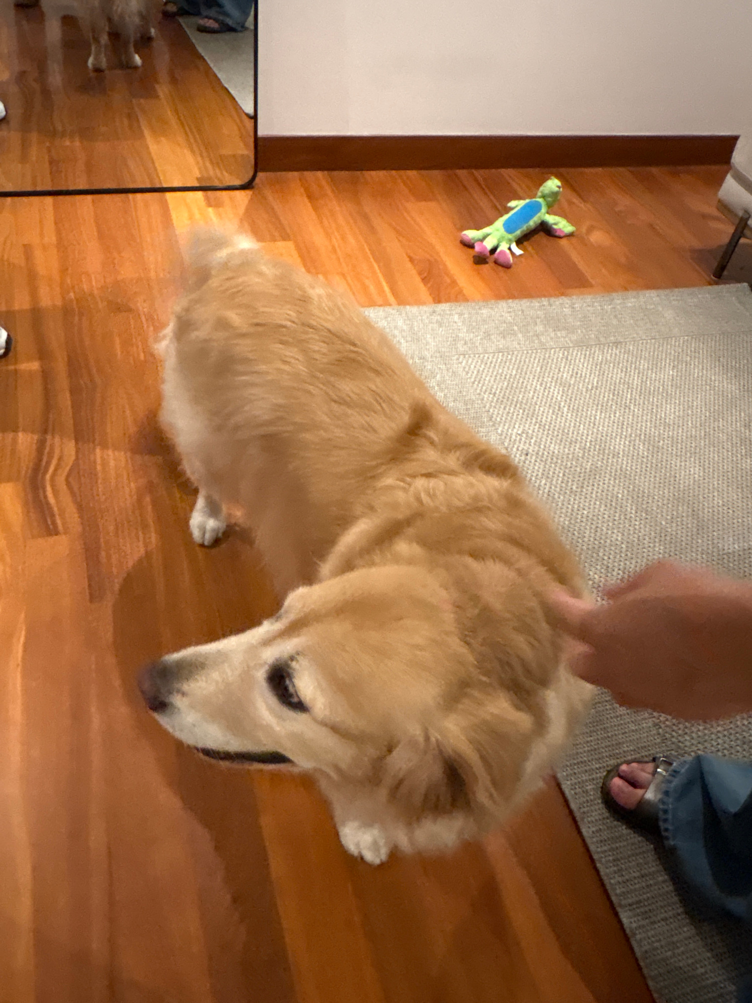 An indoor, slightly overhead shot captures a light-colored dog, likely a Golden Retriever or similar breed, being gently petted by a human hand. The dog, with tan fur and white paws, stands partially…read more