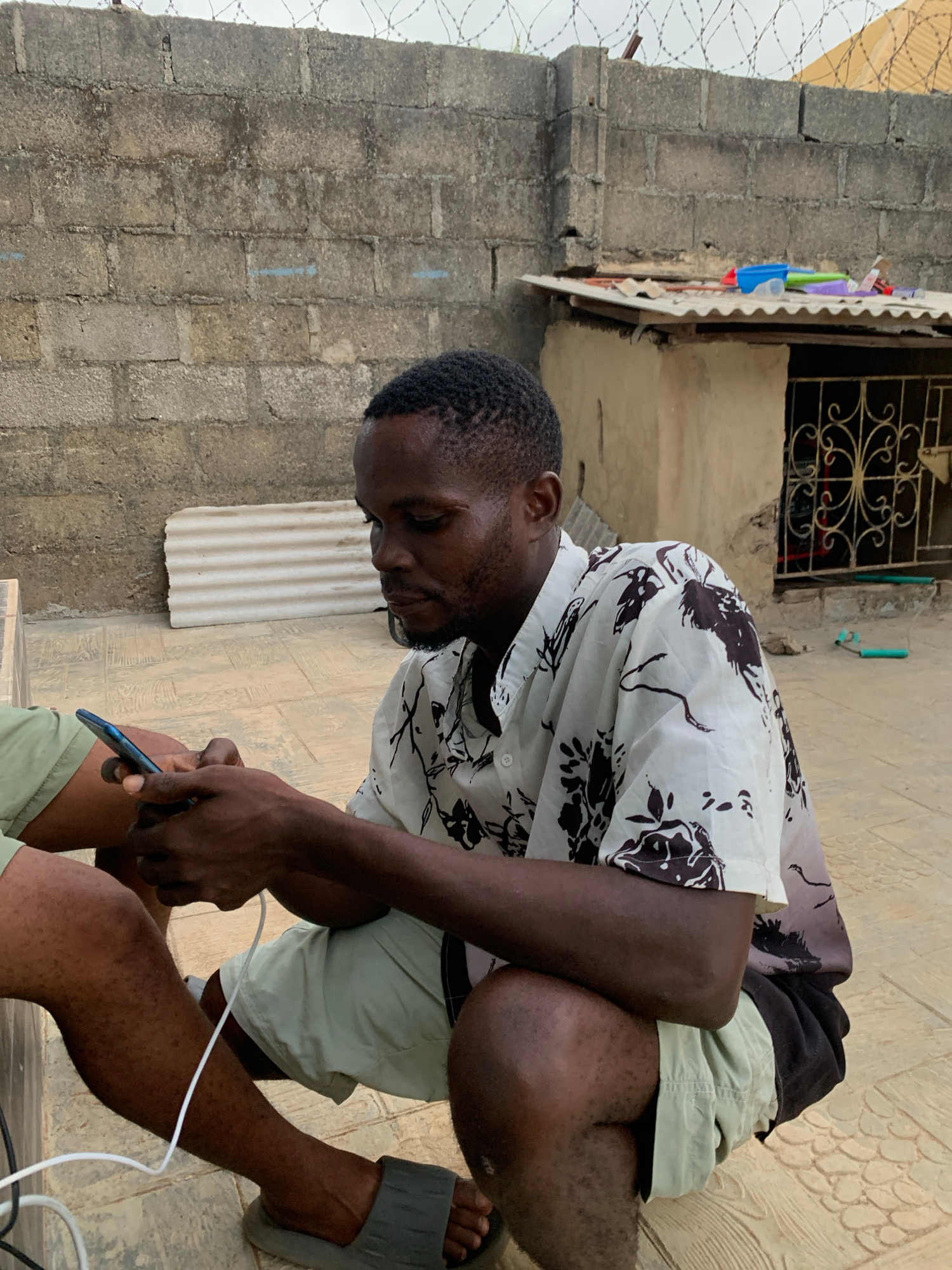 An African male squats on a textured surface next to a block wall in Ikorodu, Nigeria. He is wearing a white, short-sleeved shirt with dark brown floral patterns, light green shorts, and gray sandals.…read more