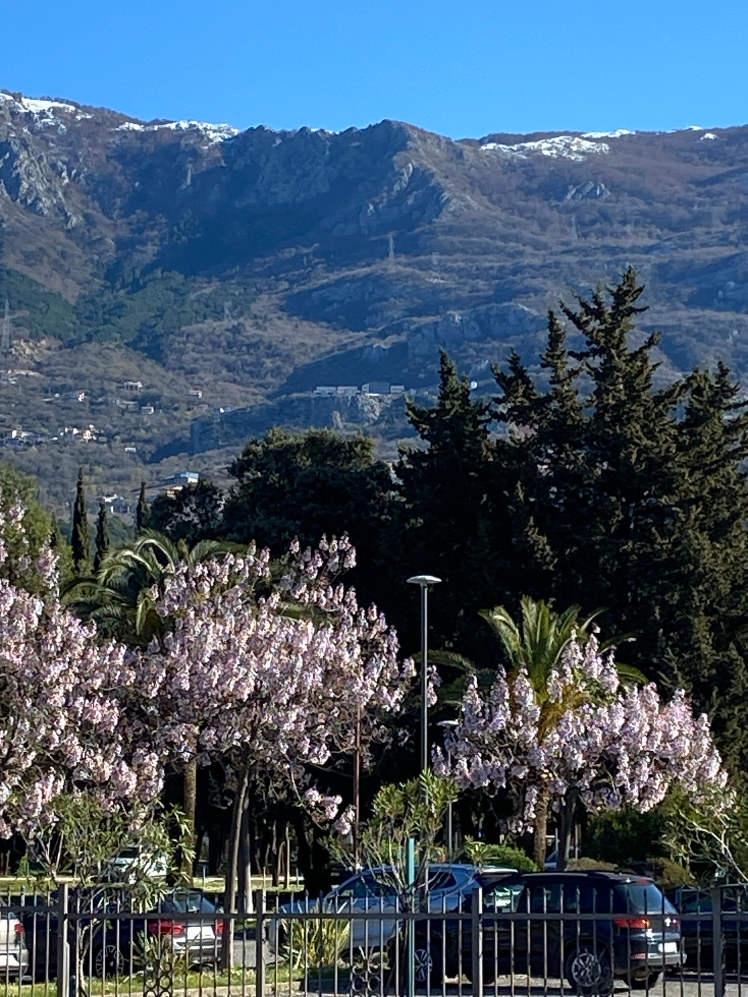 The scene shows a mountainous landscape under a clear blue sky. The mountain range occupies a significant portion of the left side of the frame, with some snow visible on its peaks. The foreground inc…read more
