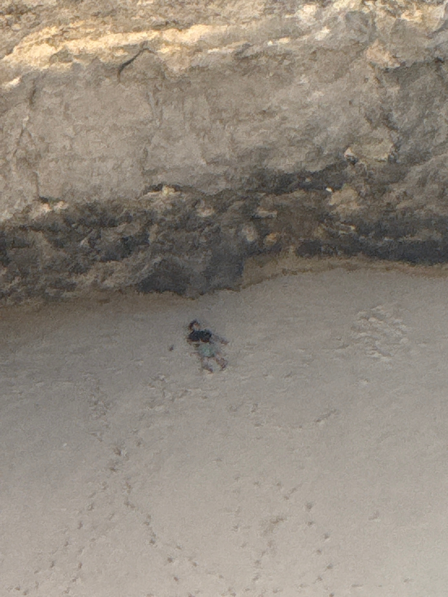 The image shows a person lying on a sandy beach at the base of a rocky cliff. The location is likely a remote beach on Nusa Penida, Indonesia. The person is small relative to the scale of the cliff an…read more