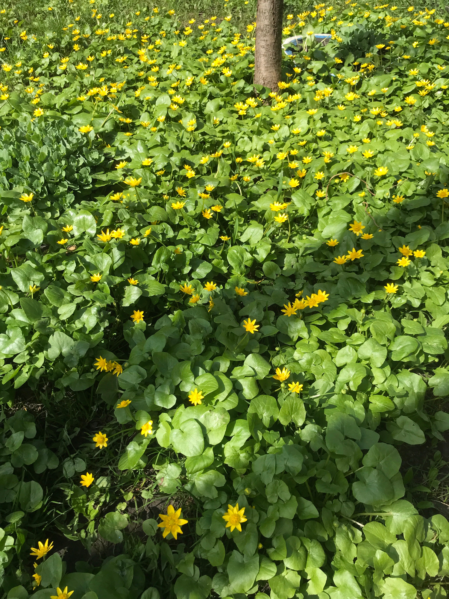 The image captures a vibrant, sunlit outdoor scene, showcasing a dense ground cover of small, bright yellow flowers amidst lush green foliage. The setting appears to be a natural or cultivated outdoor…read more