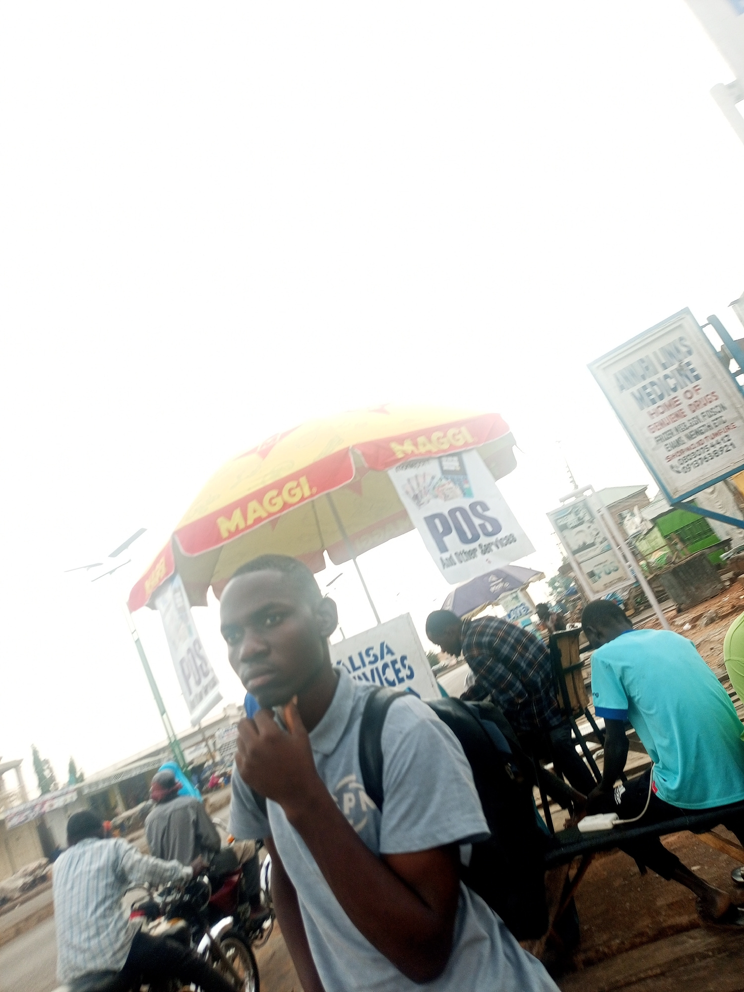 The scene depicts a street in what appears to be Tempure, Nigeria. A young man wearing a grey t-shirt and a backpack is in the foreground, holding something to his mouth. Behind him is a "Maggi" brand…read more