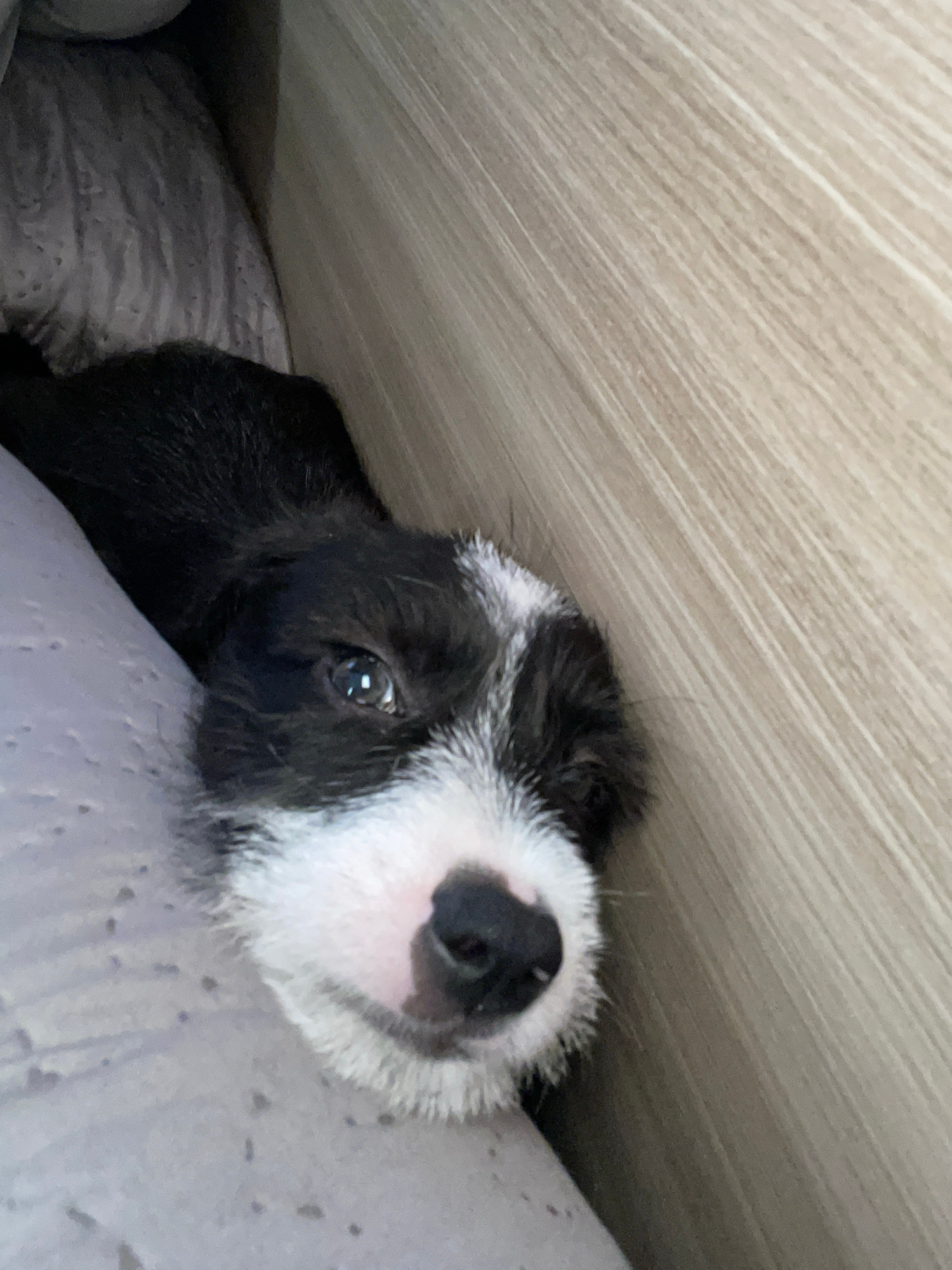 A black and white dog is lying under a piece of furniture on a light-colored wood floor. The dog's head is tilted and facing the camera. Part of the dog's body is covered by a gray fabric. The locatio…read more