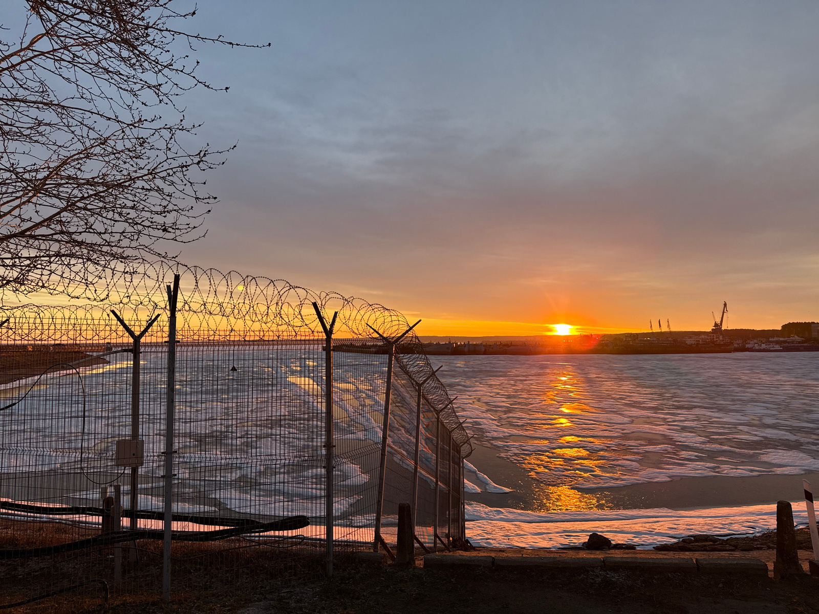 The image captures a sunset view in Chaikovsky, Russia. A chain-link fence topped with barbed wire dominates the foreground. A bare tree branch is visible on the left. Behind the fence, a body of wateβ¦read more
