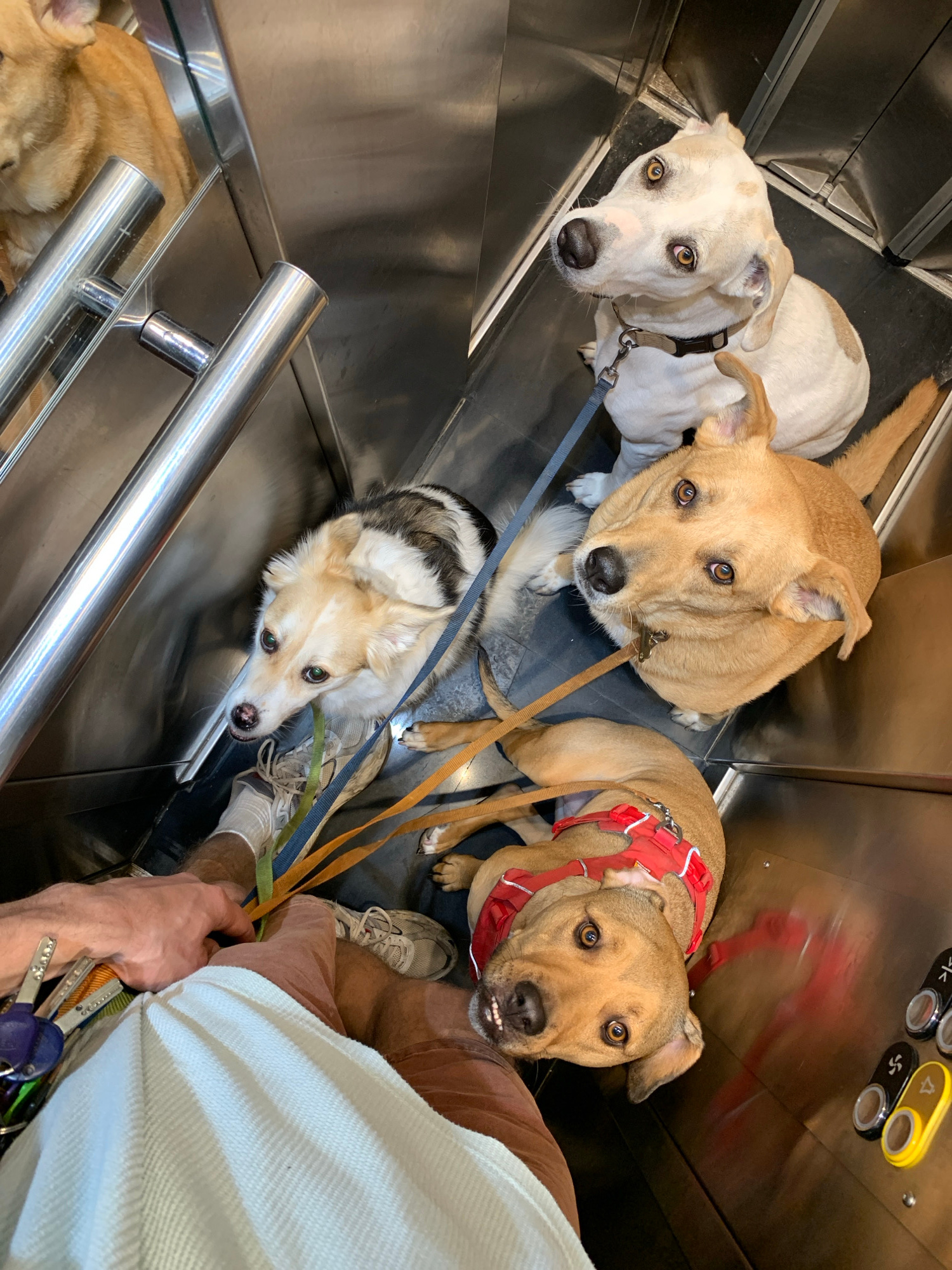 A high-angle shot shows five dogs and a person in what appears to be a metal-lined elevator. The elevator features a metal handrail and control panel visible in the background. The dogs are a mix of b…read more