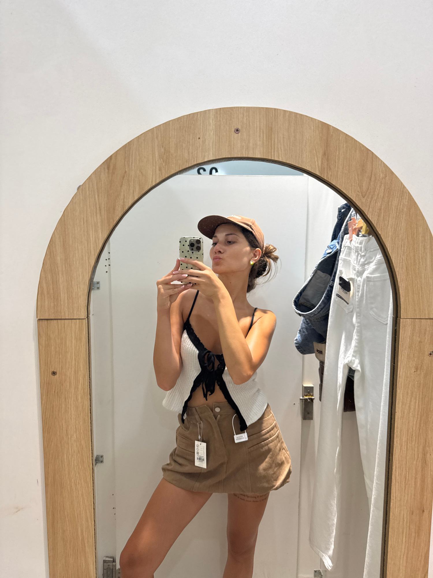 A woman in a changing room takes a selfie in front of a wooden-framed mirror. She wears a brown baseball cap, a white tank top with black straps, and brown shorts with tags. Above her are hung article…read more