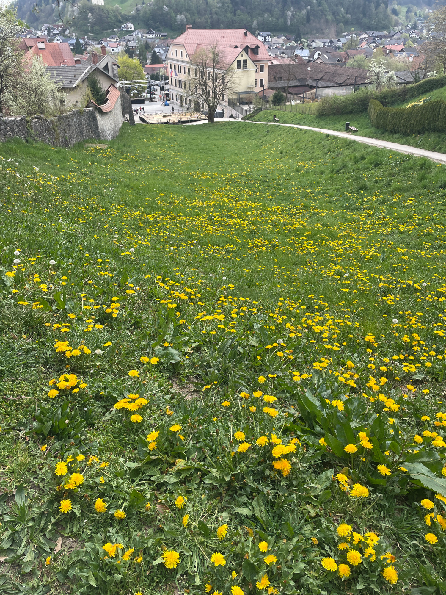 The image shows a grassy field with numerous yellow dandelions in Skofja Loka, Slovenia. The field slopes down towards the town, which is visible in the background. A white path runs along the edge of…read more