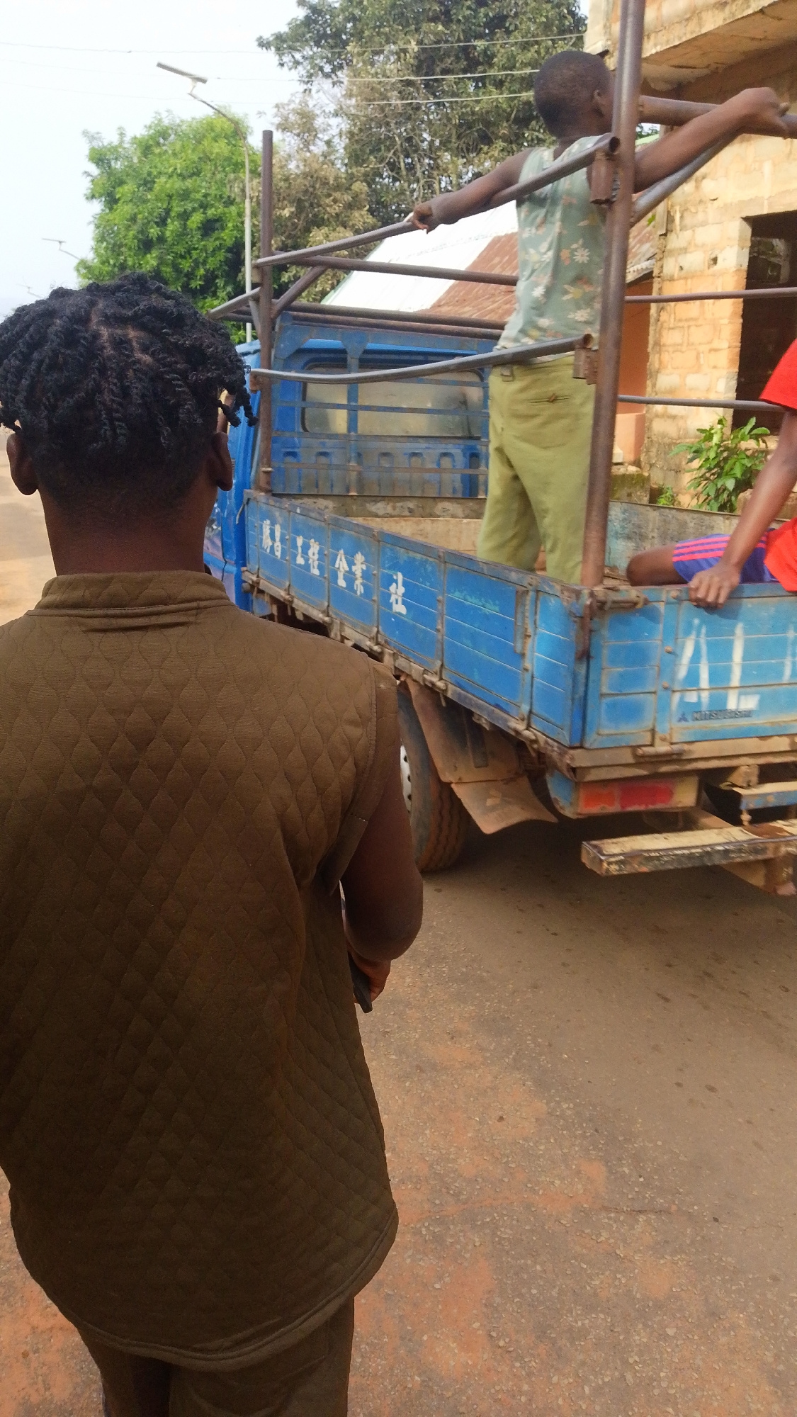 The image depicts a street scene in Enugwu-Ukwu, Nigeria. In the foreground, a person with braided hair wears a brown quilted vest and matching pants. The person's back is to the viewer. To the right,…read more