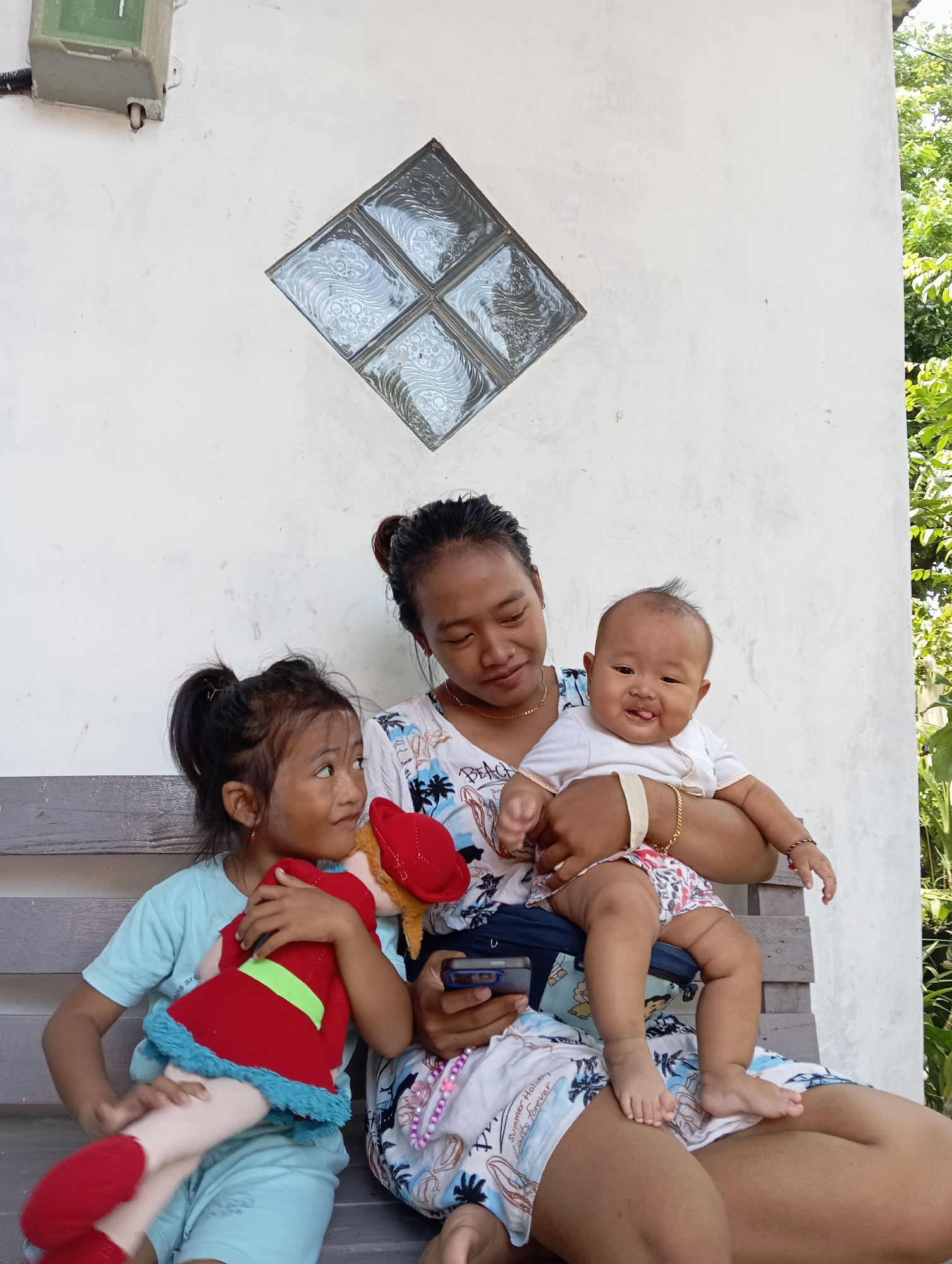 This image captures a relaxed outdoor family moment in Baron, Indonesia, featuring an adult woman with two children. The scene suggests a warm, casual gathering. In the center, an adult woman with da…read more
