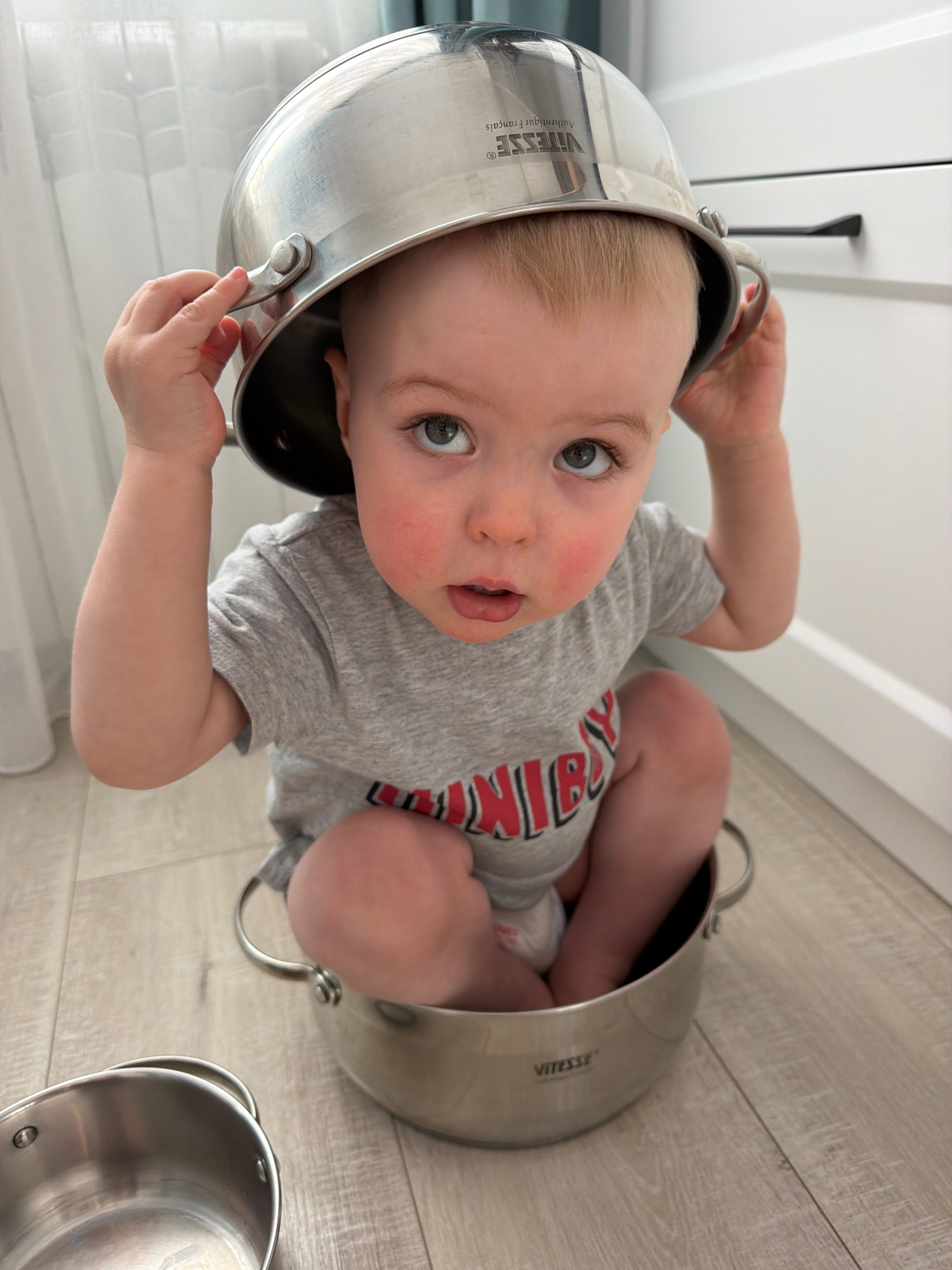 A baby is sitting in a silver pot on a wooden floor. The baby is wearing a grey shirt with red lettering and has another silver pot on its head. The baby has blonde hair and blue eyes and is looking a…read more