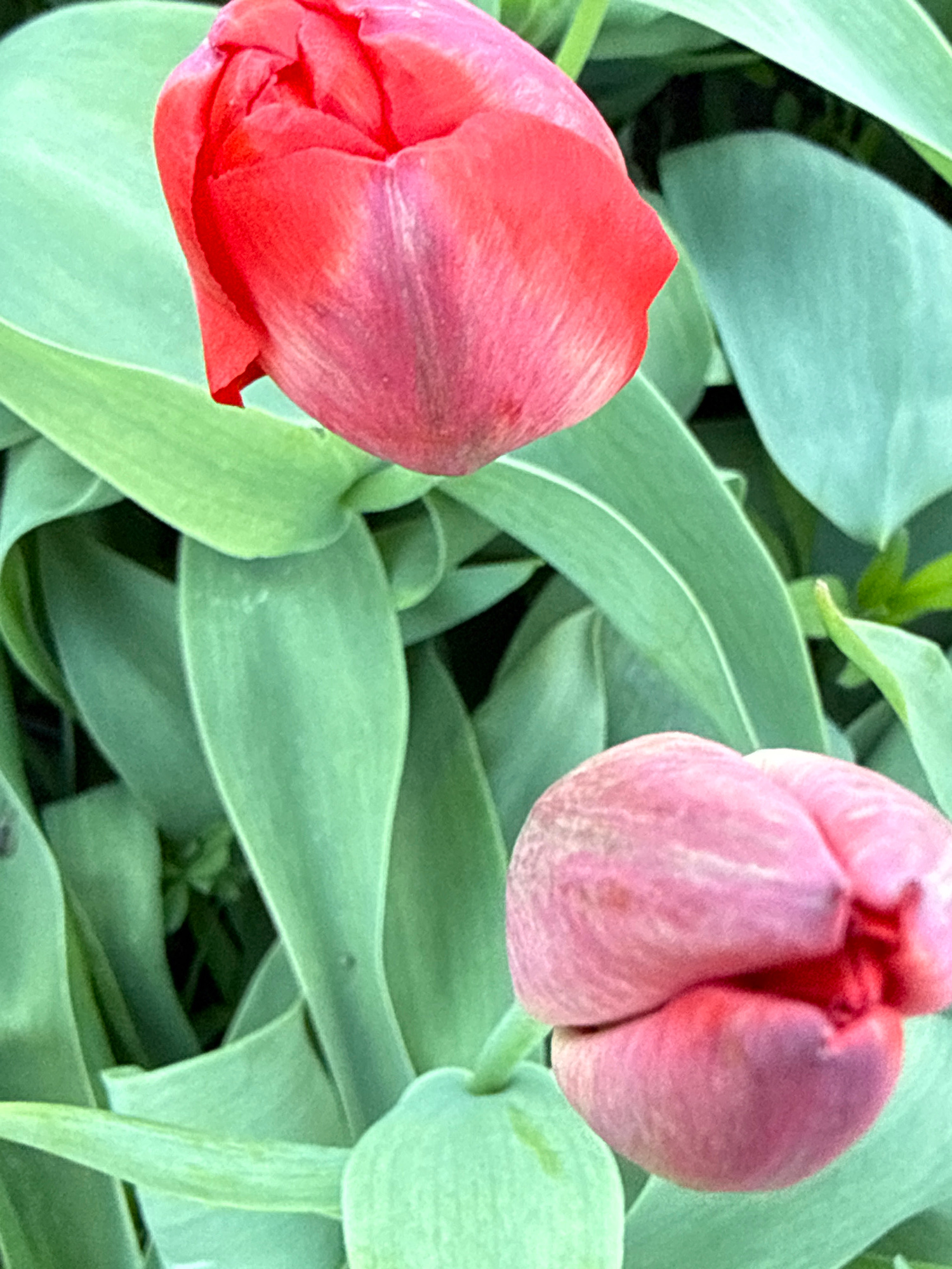 The image shows two closed tulip buds surrounded by green leaves. The bud on the left is primarily red with some purple shading, while the bud on the right is mostly pink with some red shading. The le…read more
