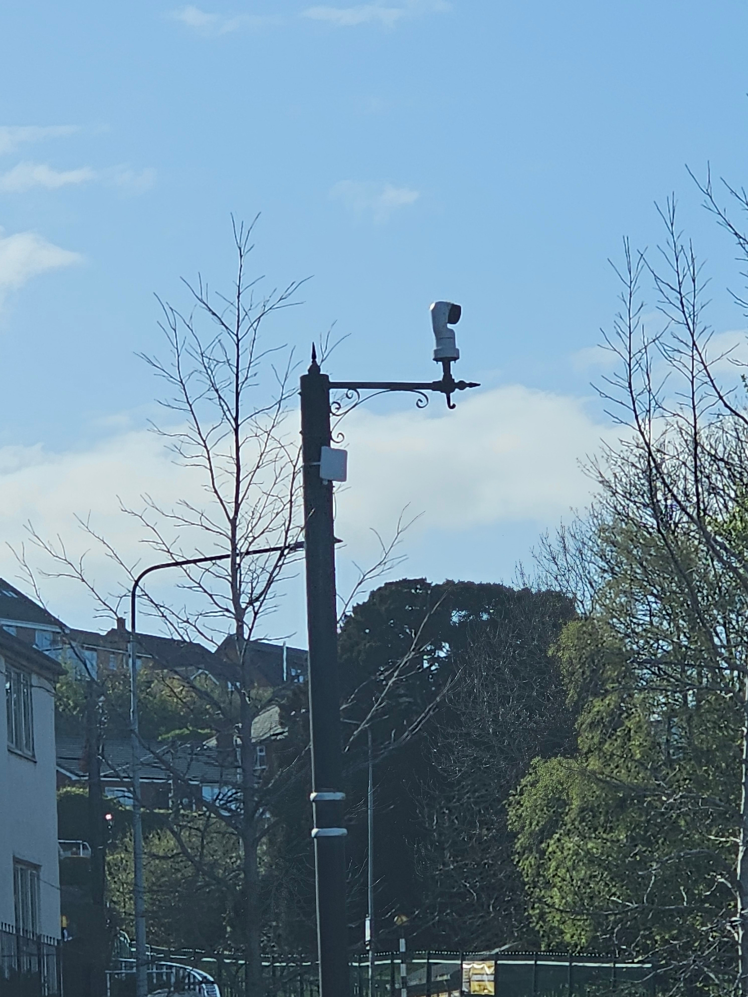 The image depicts an outdoor daytime scene, featuring a prominent dark utility or lamppost against a clear blue sky with sparse white clouds. The photograph appears to have been taken in late winter o…read more