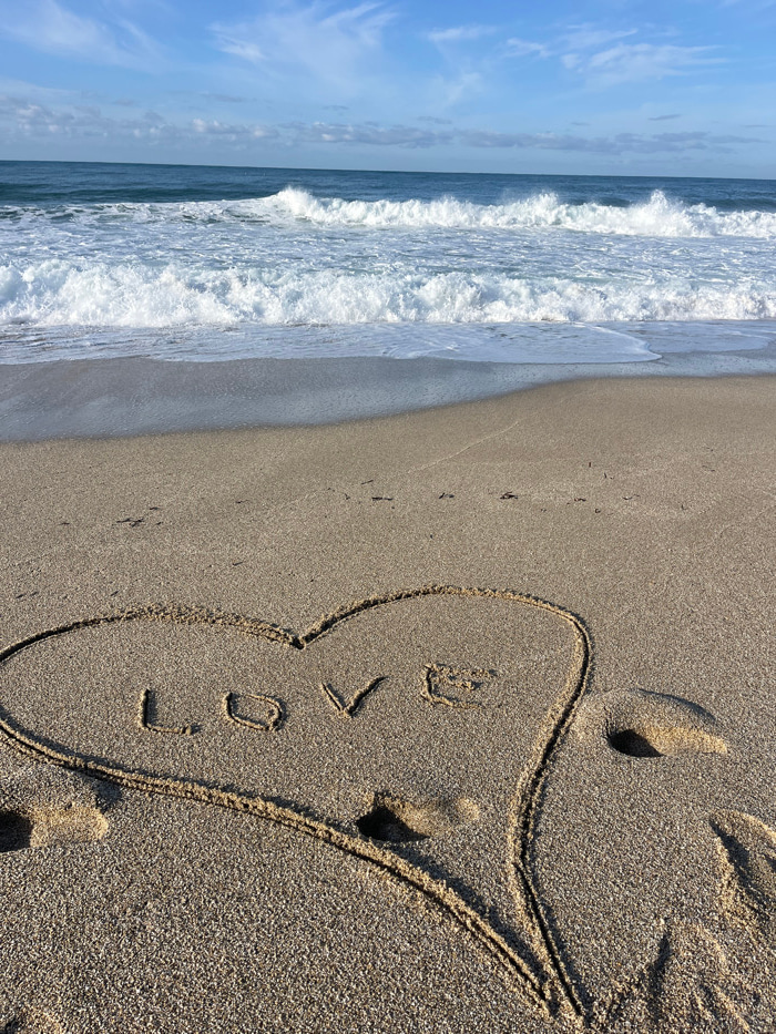 The image captures a serene beach scene, with the perspective angled slightly downwards, showcasing the transition from the ocean to the sandy shore. The left side of the frame features the vast blue…read more