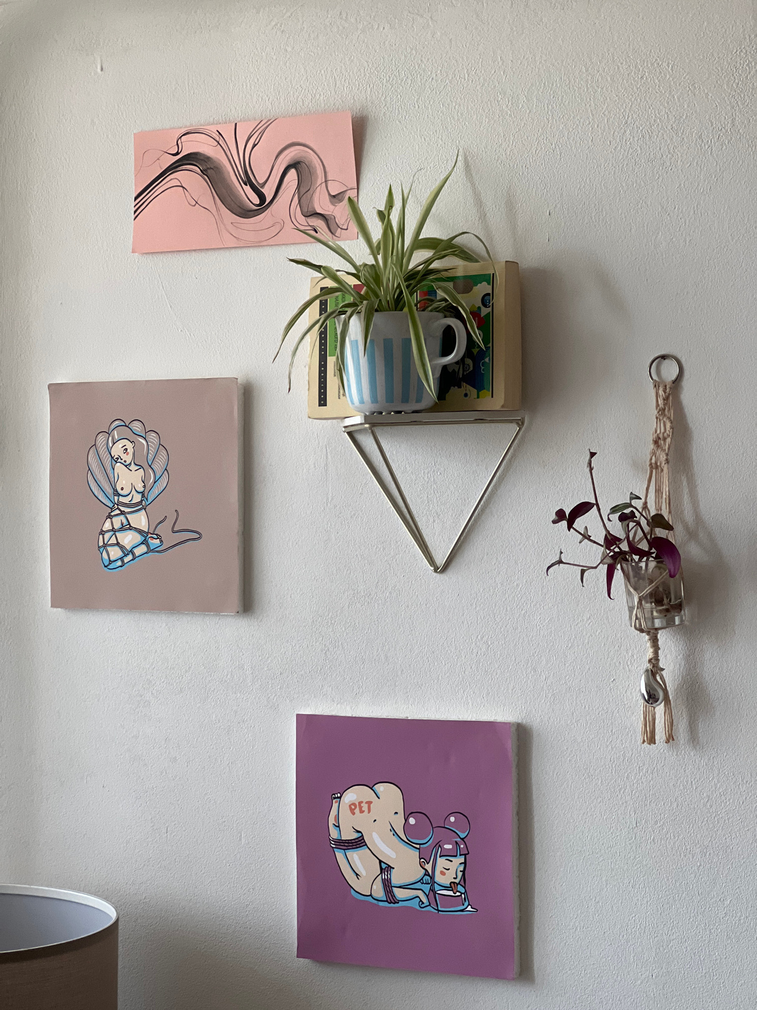 A close-up, eye-level shot depicts a section of a white, textured wall adorned with various decorative items. From left to right: a small, pink rectangular card with a swirling, dark gray abstract des…read more