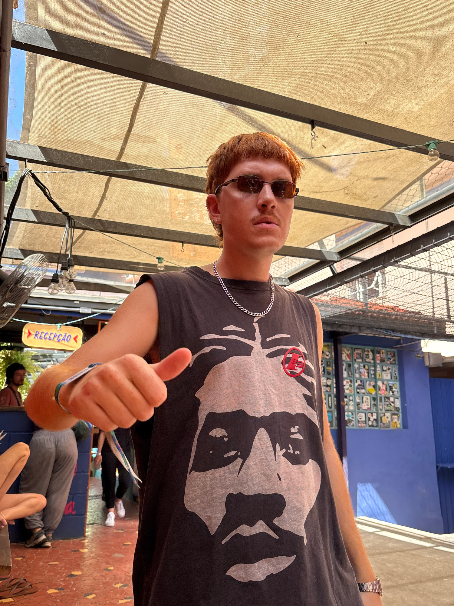 A young man with reddish hair and sunglasses gives a thumbs-up in an outdoor setting, likely in São Paulo, Brazil, based on the "Recepção" sign (Portuguese for reception). He wears a grey tank top wit…read more