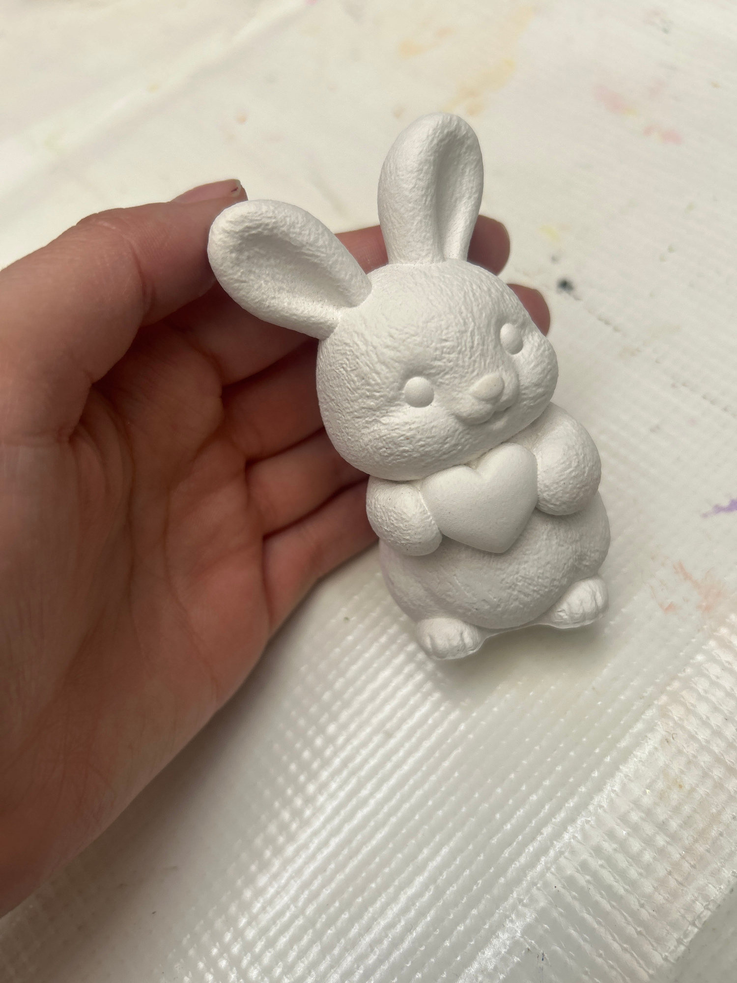 A hand holds a white, unpainted ceramic bunny figurine against a white, textured surface. The bunny is lying on its back, with its head, ears, paws, and rotund body clearly visible.