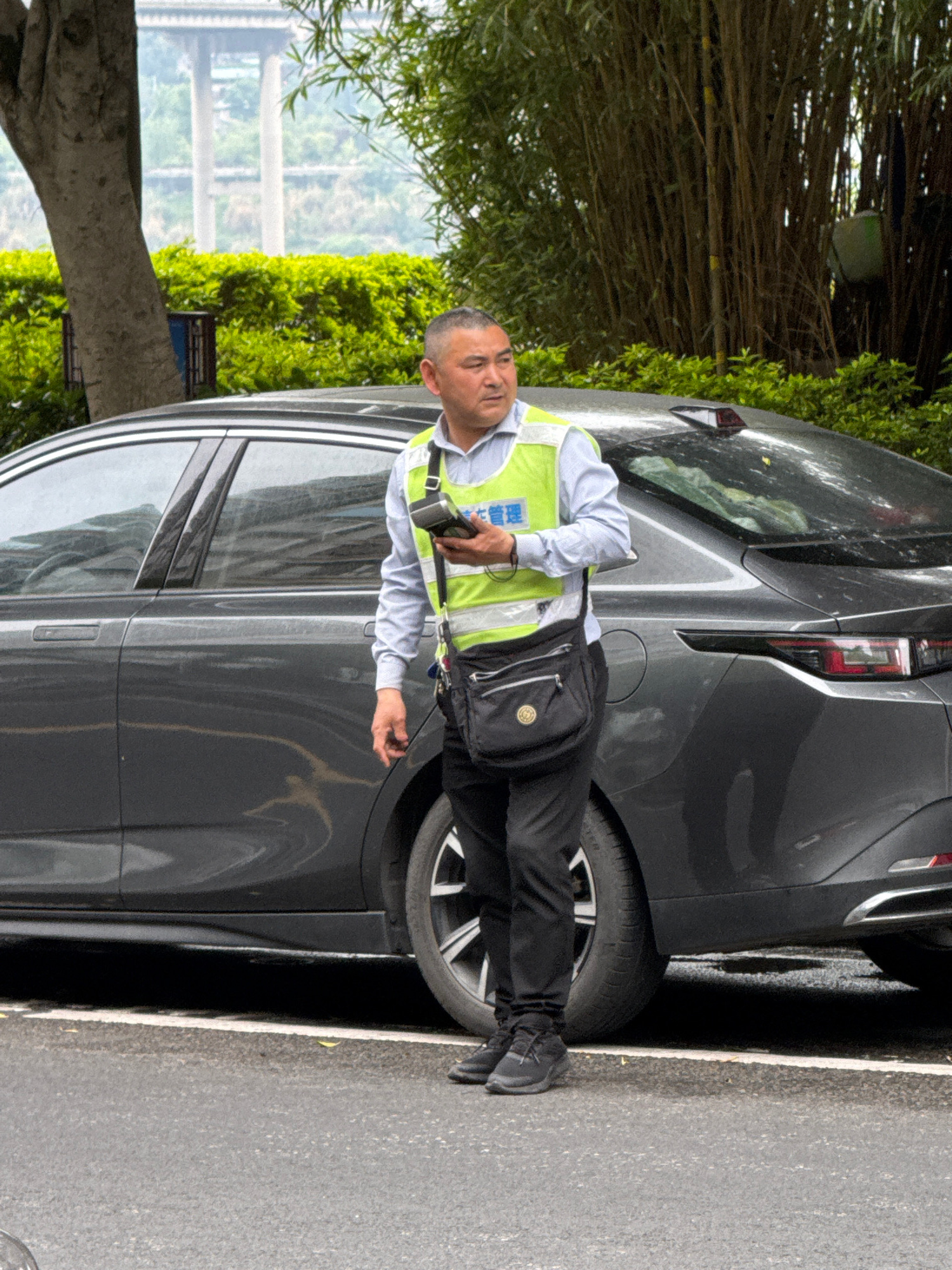 A man wearing a light blue shirt, black pants, and a yellow traffic vest stands next to a parked gray SUV. The man has a black bag slung across his body and holds a small black object in his hand. The…read more