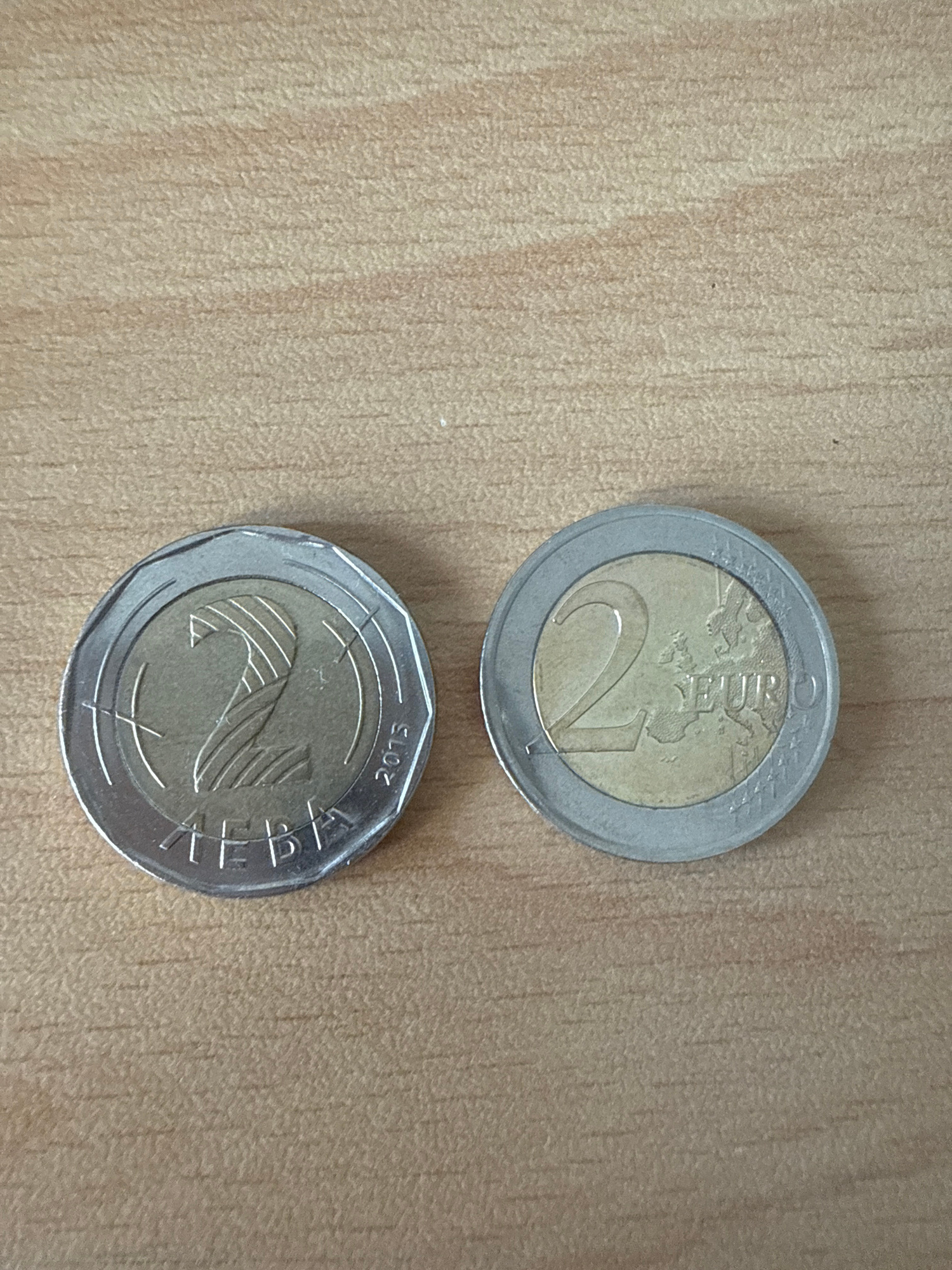 The image shows two 2 euro coins on a wooden surface. The first coin displays the standard "2 EURO" text and a map of Europe. The second coin appears to be a commemorative edition. The text "РЕПУБЛИКА…read more