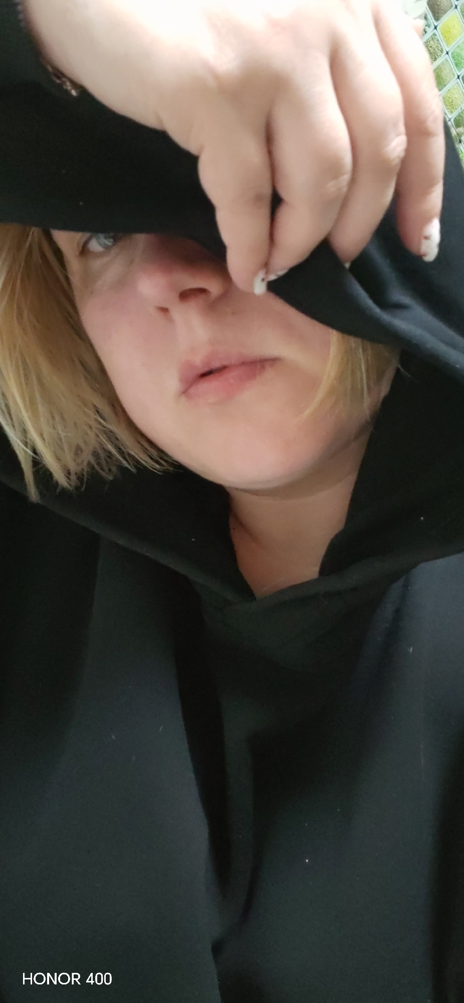 A person with blond hair and fair skin is wearing a black hooded sweatshirt, with the hood pulled up and partially covering the face. One hand is holding the hood fabric near the forehead. The visible…read more